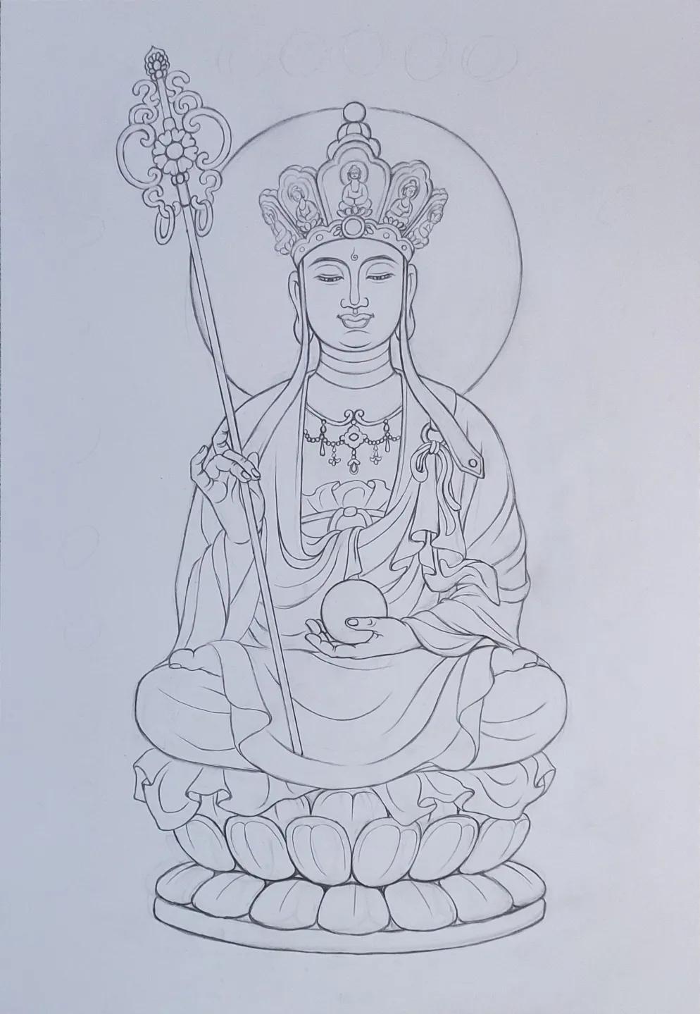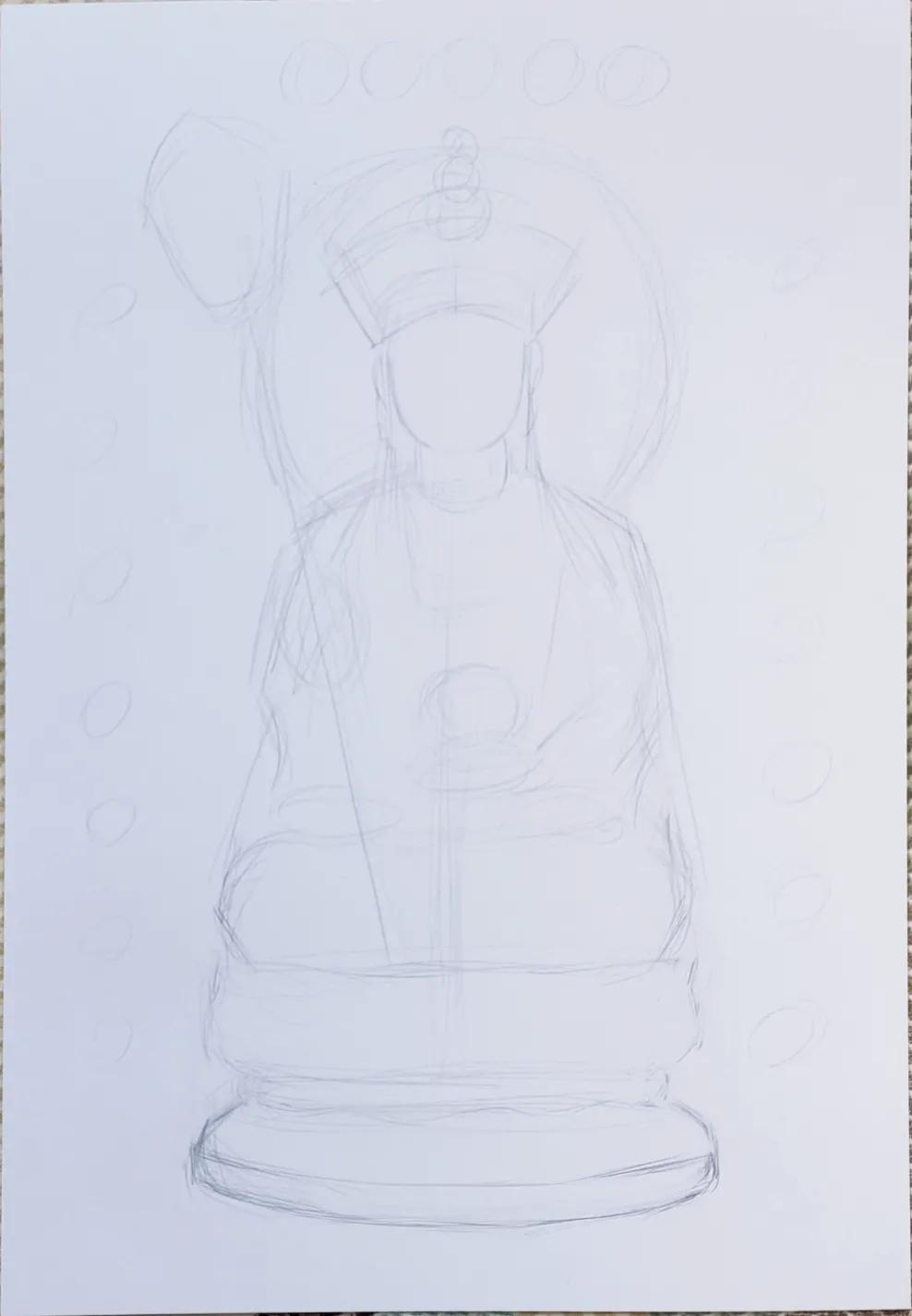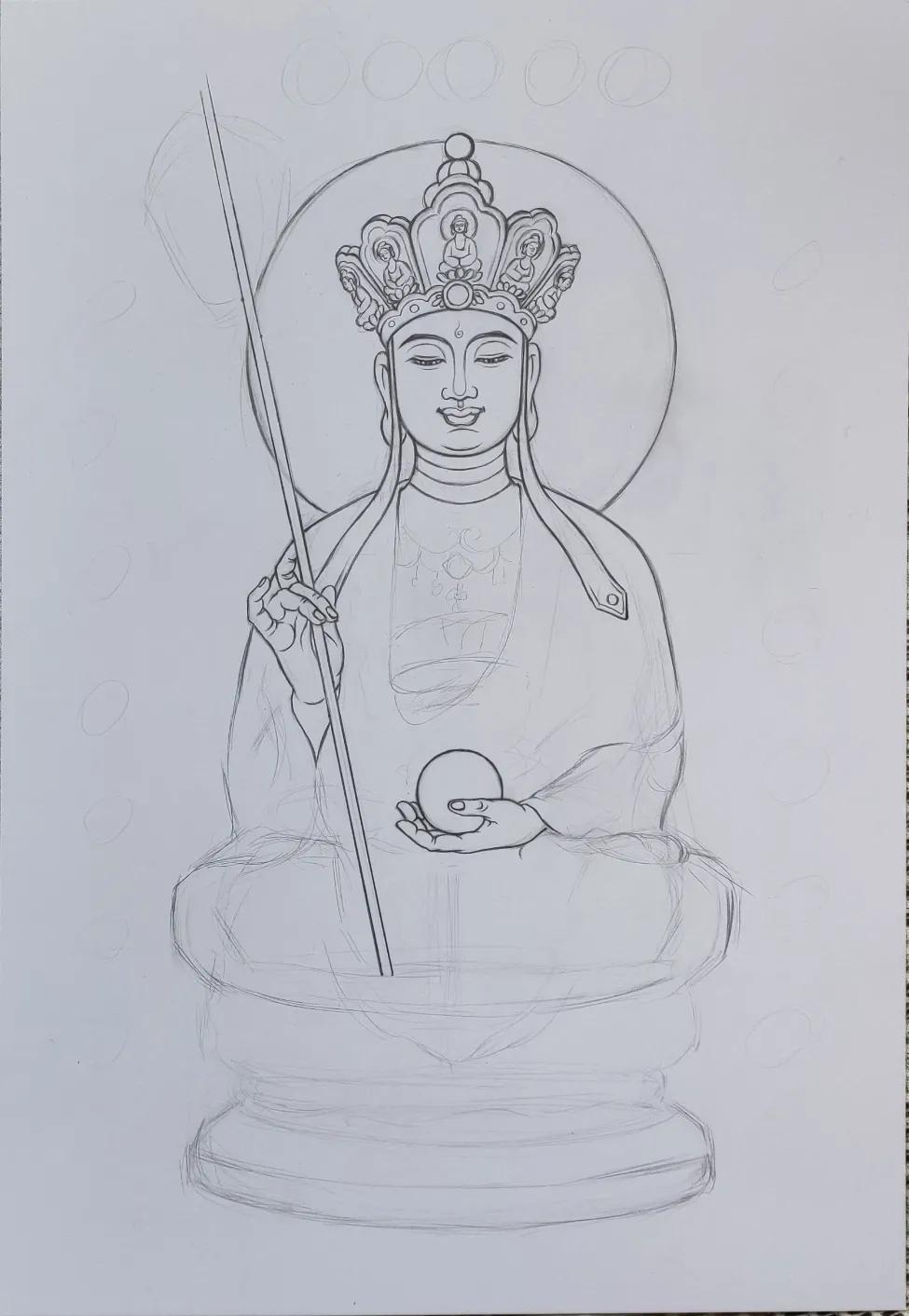 導讀我,作者超蛋,畫了一幅地藏王菩薩像,分享以下過程:1 我用的是八開白卡紙,先定位置,畫出大概形狀。2 畫了頭,五官根據自己的審美來畫,我喜歡長眼睛,厚嘴。3 手比臉難畫,擺好姿勢,拍照,照著自己的手畫