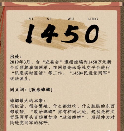 “1450”這個名字,在中國大陸已經不是什么生僻詞匯。2019年,臺“農委會”發布公告稱,計劃招募至少4人,“在網絡論壇等社交平臺進行訊息實時澄清”,總預算1450萬元新臺幣。于是,臺灣網友就給民進黨網軍起了個“諢號”:1450。