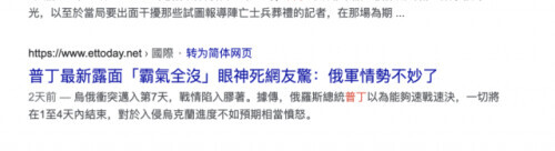 此次俄烏沖突期間,我們發現,大陸互聯網平臺留下了不少疑似“1450”的滲透痕跡。盡管他們為了迎合大陸讀者將表達改成了簡體字,但繁簡轉換并不能轉換其用詞習慣和臺式翻譯。