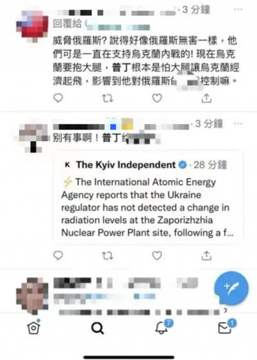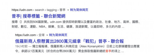 這些賬號在轉載已經被轉化為純大陸版本的信息時,仍然沿用了純臺灣的“普丁”以及很明顯的臺灣排版才用的“引號”。