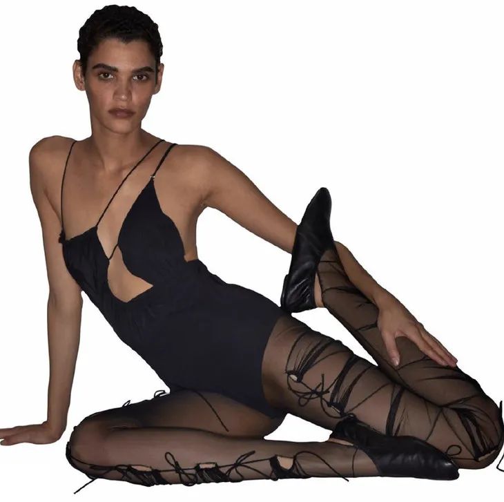 不止大牌,玩轉絲襪的新晉潮牌也不少,它們給了絲襪新變化。被Bella狂野演繹而順勢大紅的Nensi Dojaka就很典型。Nensi Dojaka的設計以半透明的絲質面料為主,同時她的作品有明顯的解構手法,呈現出兼具原始感和詩性的裸露。