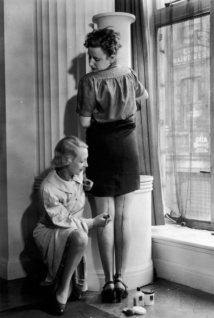 處在傳統與解放之間過渡的女性迫切需要表達自我的單品,這也引起了絲襪狂潮。二戰期間,因為尼龍材質的特殊性被列為軍需品,尼龍絲襪生產被叫停,但也無法阻止女性追求絲襪的愿望——大家會在腿上畫上“偽絲襪”來給自己的造型加分。