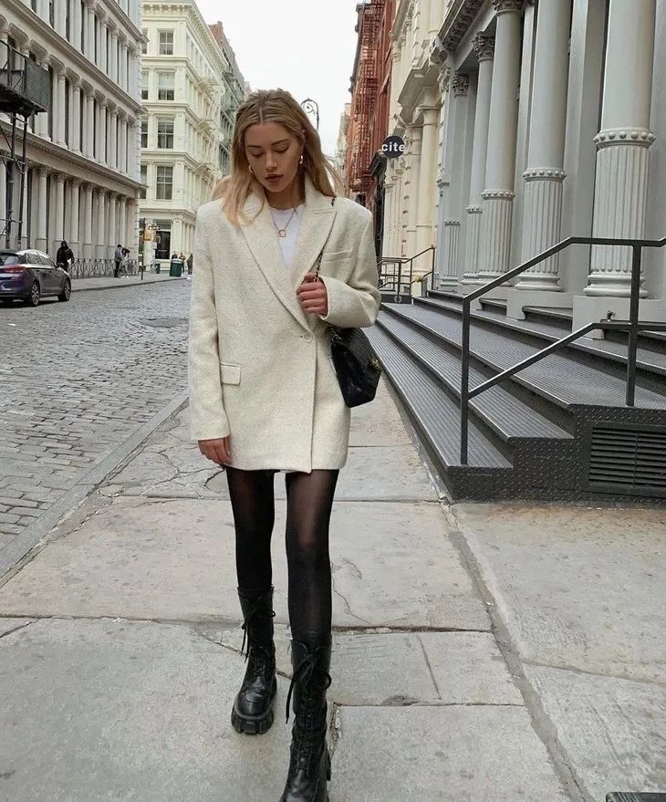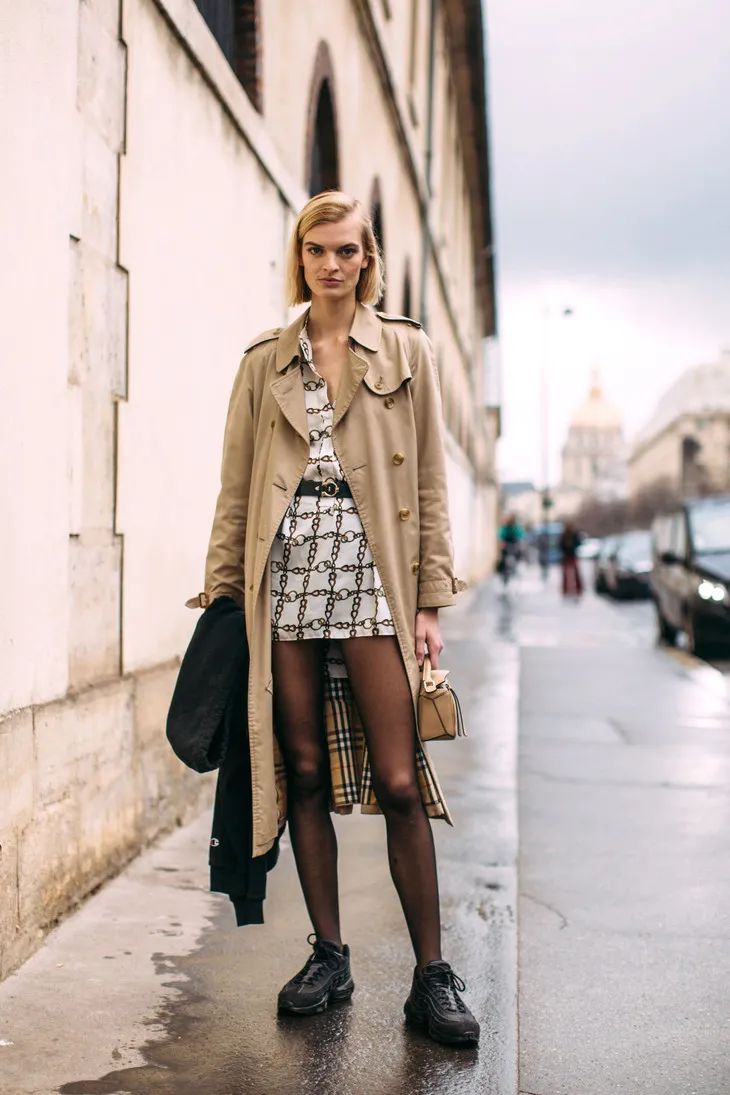 黑絲最保守的搭配方法莫過于total black。深色裝扮很容易把自己淹沒在人海中,但秋冬季露腿又有些過于清涼,黑絲打底成了最好的選擇。微微透膚增加層次感的同時又有一些保暖效果,在天氣舒適的南方秋天更好用。