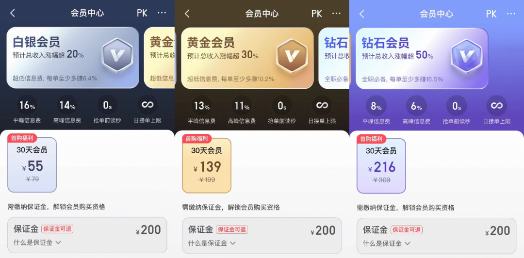該公司的運營模式也移植到小拉出行上。非會員司機一天只能搶兩單,付費購買會員,才能獲得更多搶單機會,以及更小的抽傭比例。小拉出行會員有三個會員等級,月費用55元-216元。