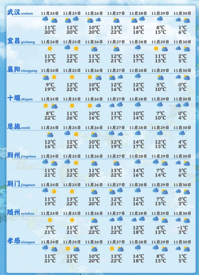 這也許是今年下半年來最強的一股冷空氣,影響范圍非常廣。湖北各地可能在月底迎來斷崖式降溫天氣,大部地區從前期持續偏暖轉為較常年偏低。以武漢為例,11月30日武漢溫度將降至零下,或將有雨夾雪天氣。