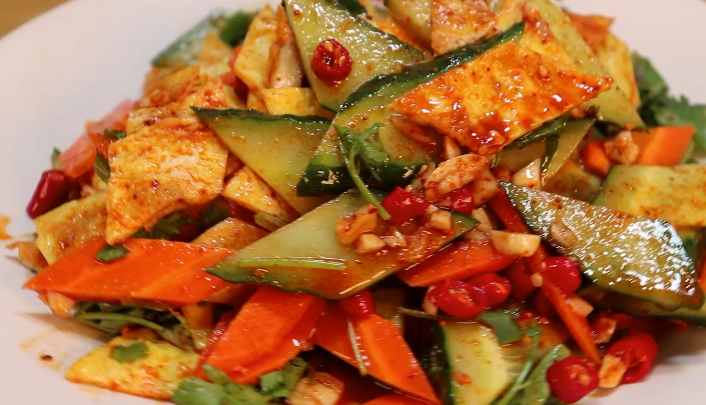 【制作食材】黃瓜,胡蘿卜,大蒜,小米椒,辣椒油,生抽,陳醋,食鹽,白糖,雞蛋,食用油,香菜