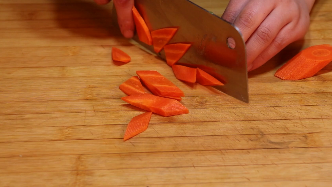 3、黃瓜已經切完了,接下來咱們再來切一下胡蘿卜,將胡蘿卜洗凈去皮,然后和黃瓜一樣的處理方法,先斜刀切成小段,然后再豎著切成小片,切完的胡蘿卜小片放到黃瓜片中就可以了。接下來咱們再把大蒜切末,小米椒切碎。