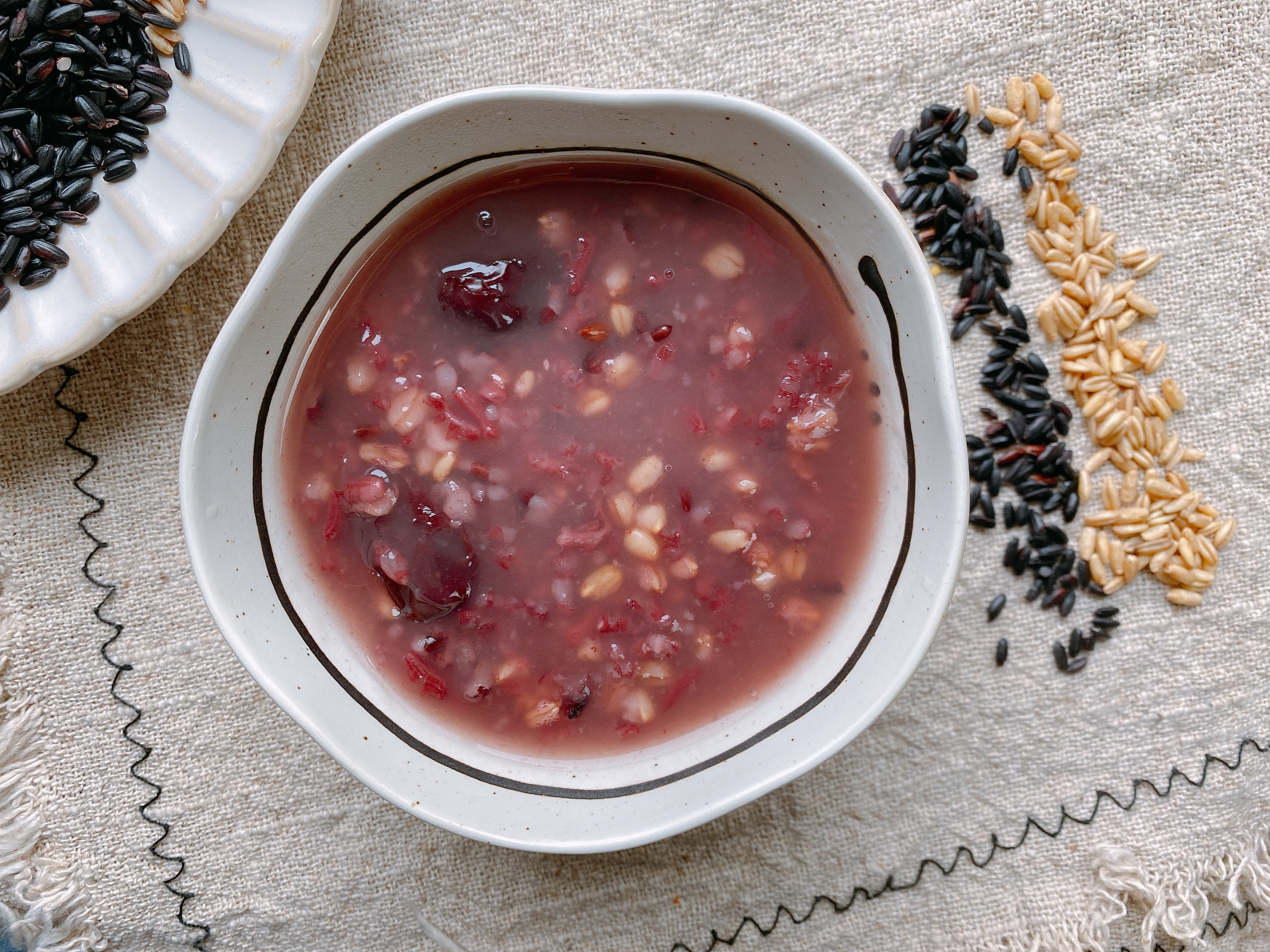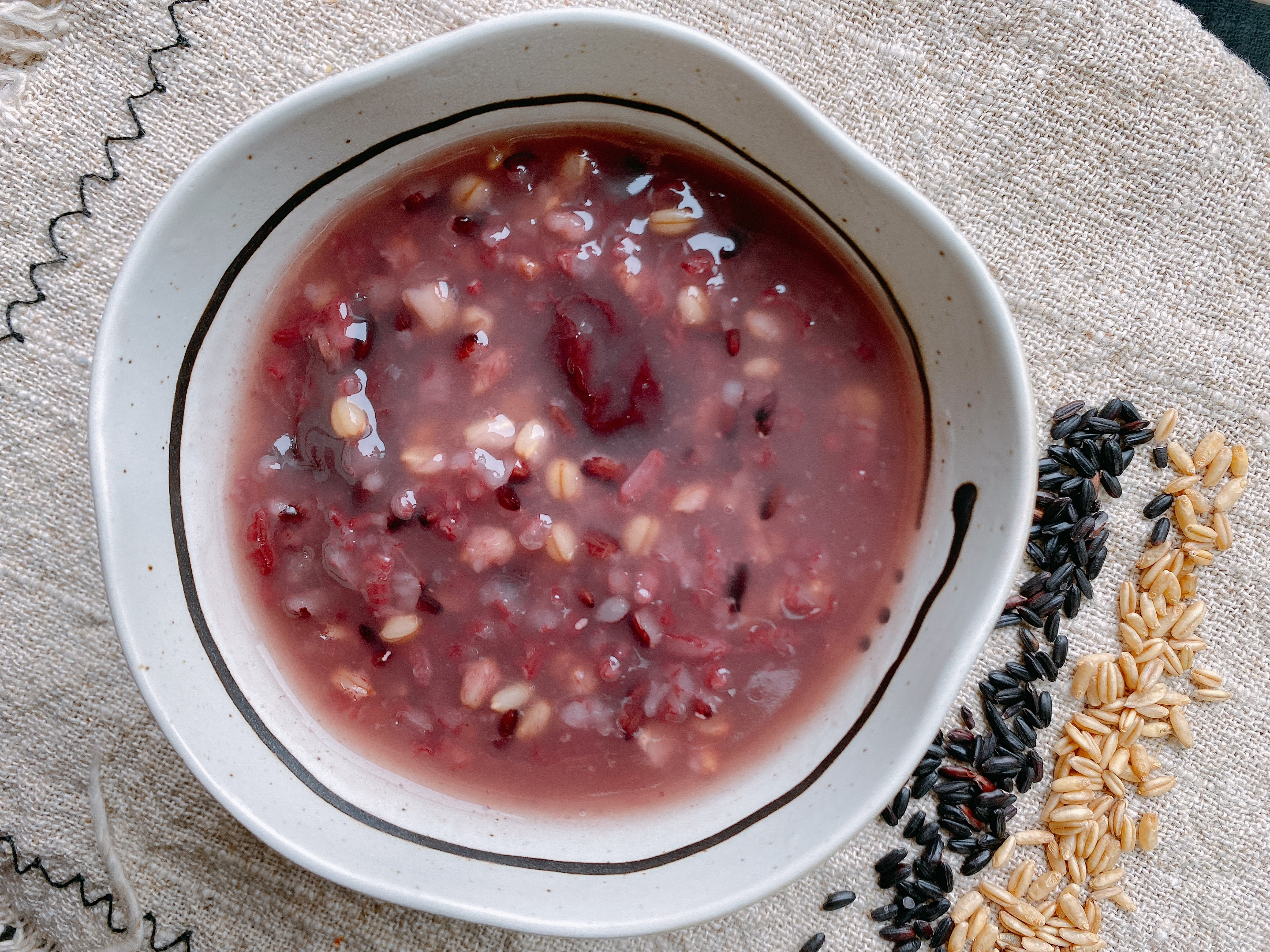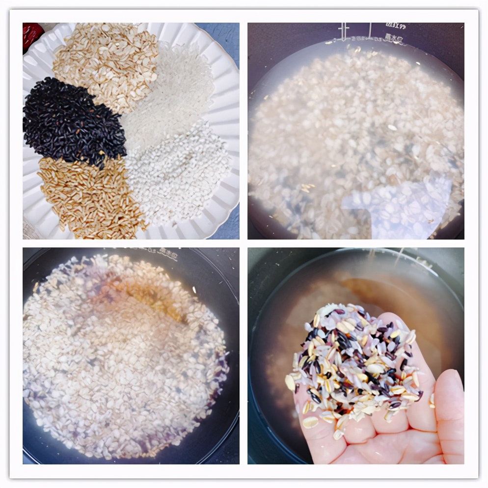【原材料】黑米30g、大米30g、糯米30g、燕麥米30g、燕麥片30g、紅棗適量;