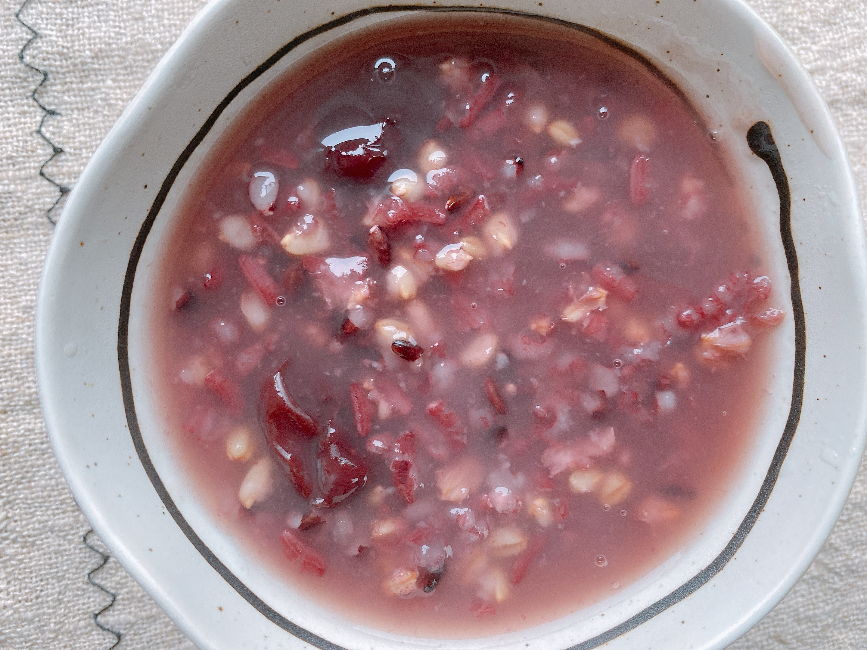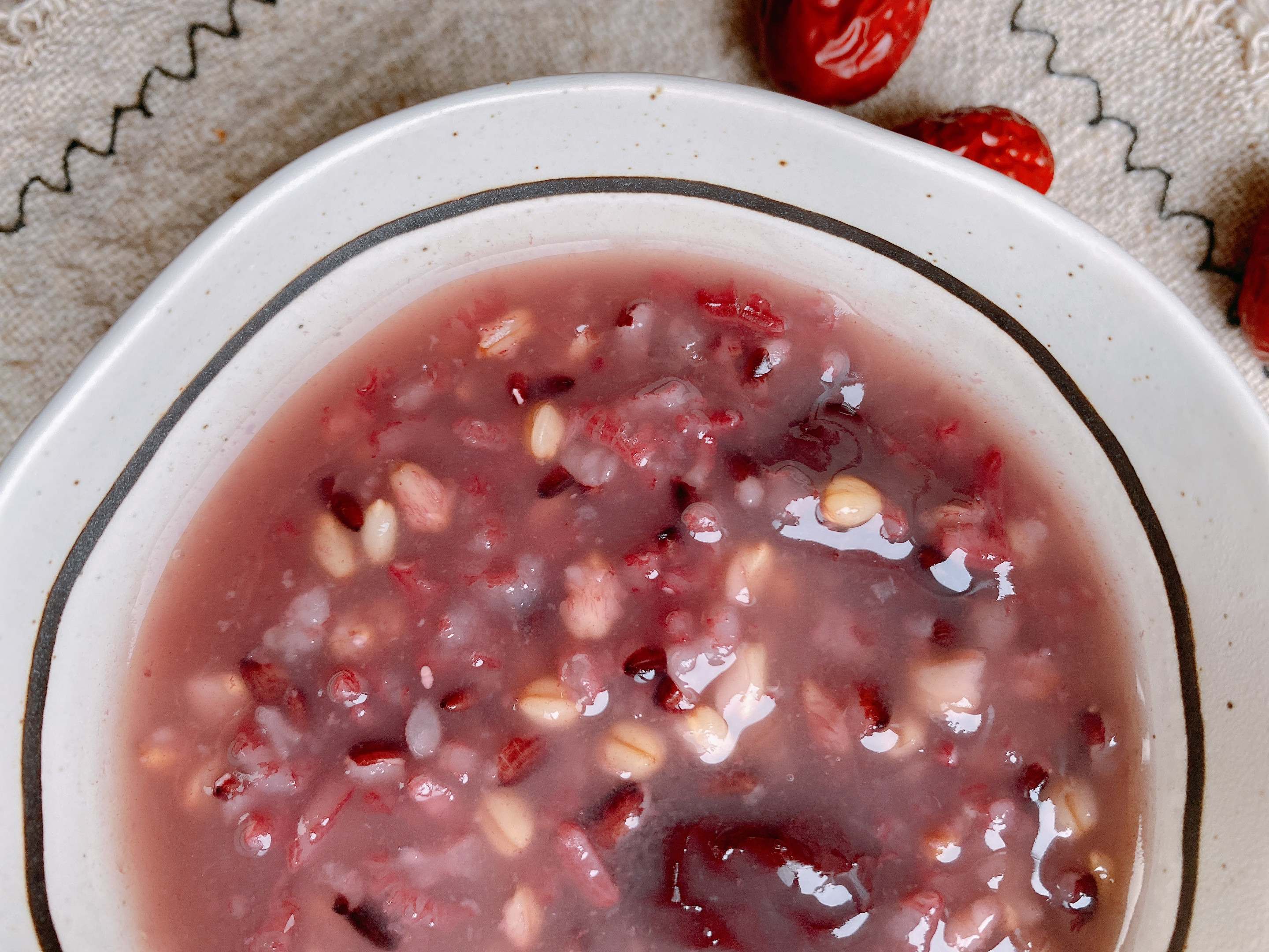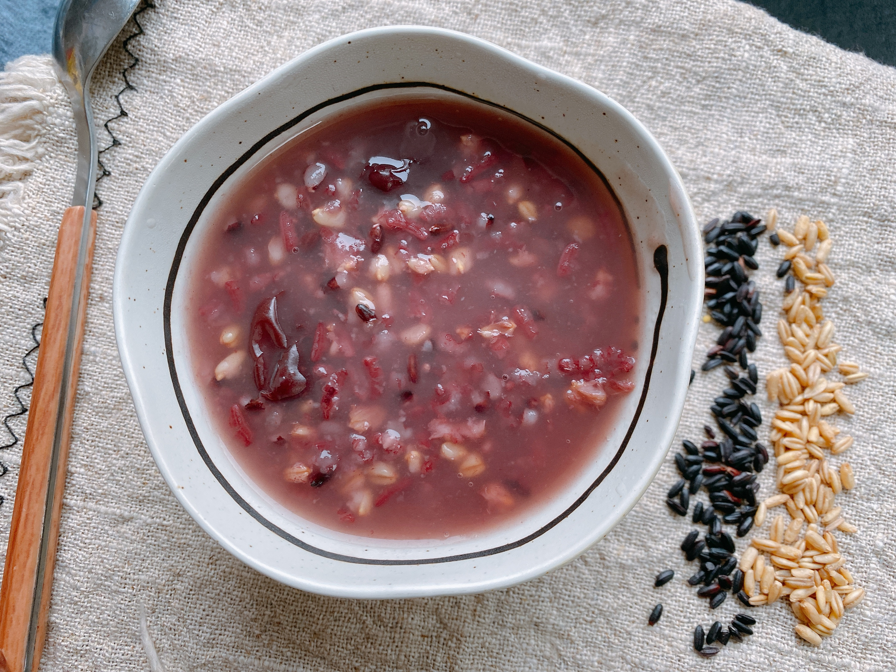 【原材料】黑米30g、大米30g、糯米30g、燕麥米30g、燕麥片30g、紅棗適量;