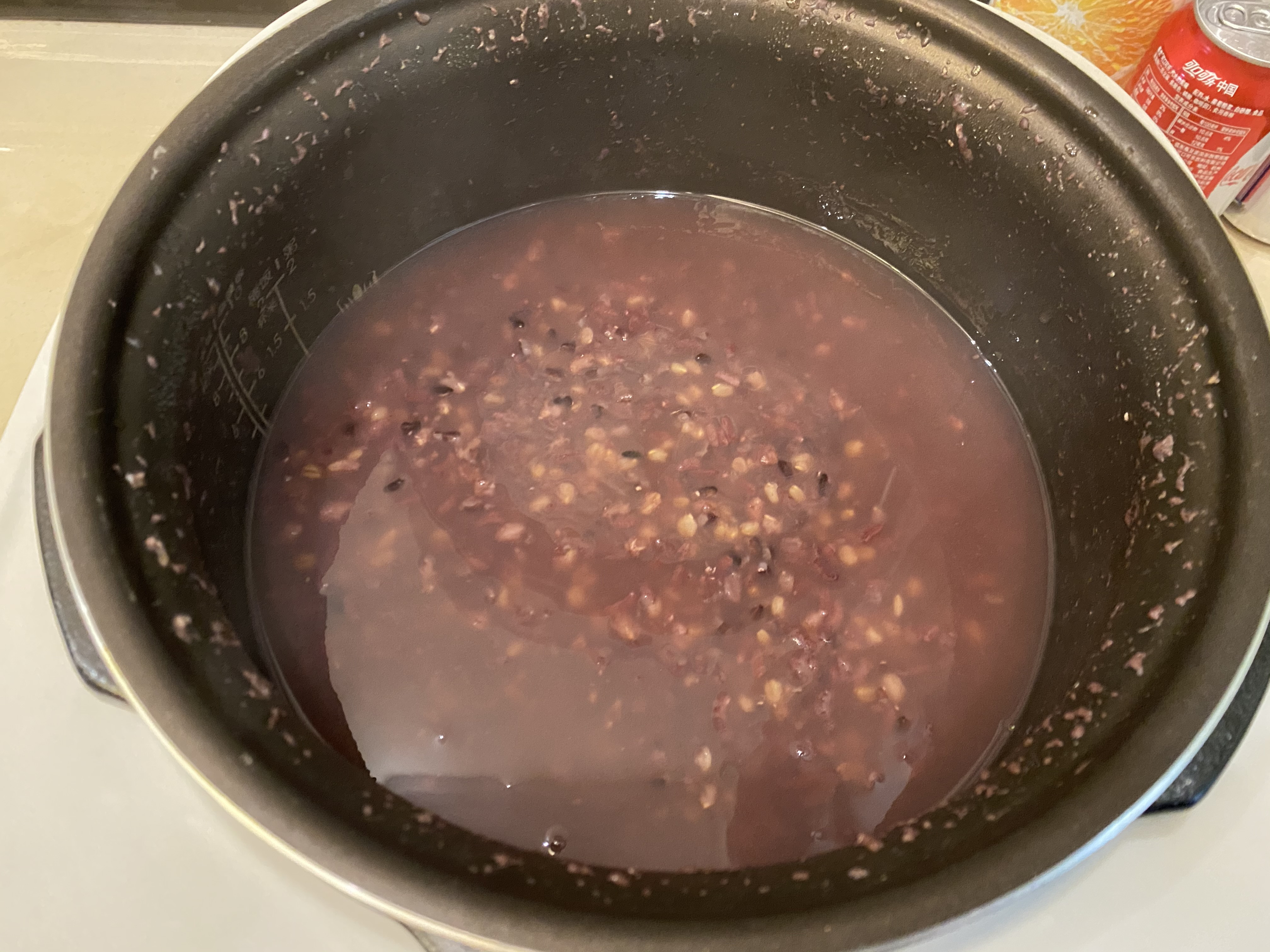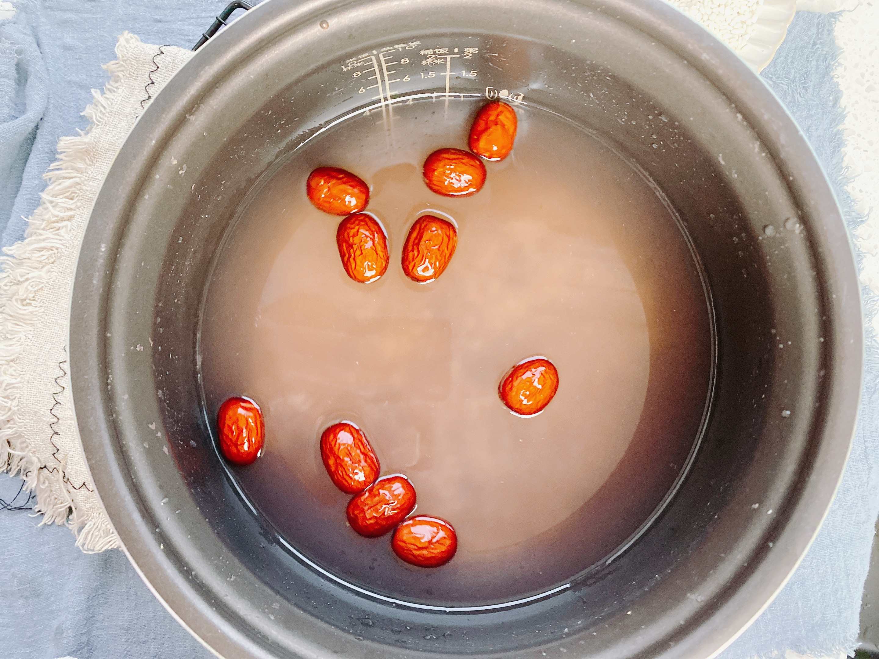 2、把準備好的食材都倒進鍋中,這些食材都比較硬,把除了紅棗以外的食材放在鍋中清洗干凈之后,加水浸泡2小時以上,現在是冬季,溫度比較低,可以提前一晚浸泡,這樣早上起來更加方便;黑米浸泡之后會出現掉色的情況,不用擔心,這是正常現象;
