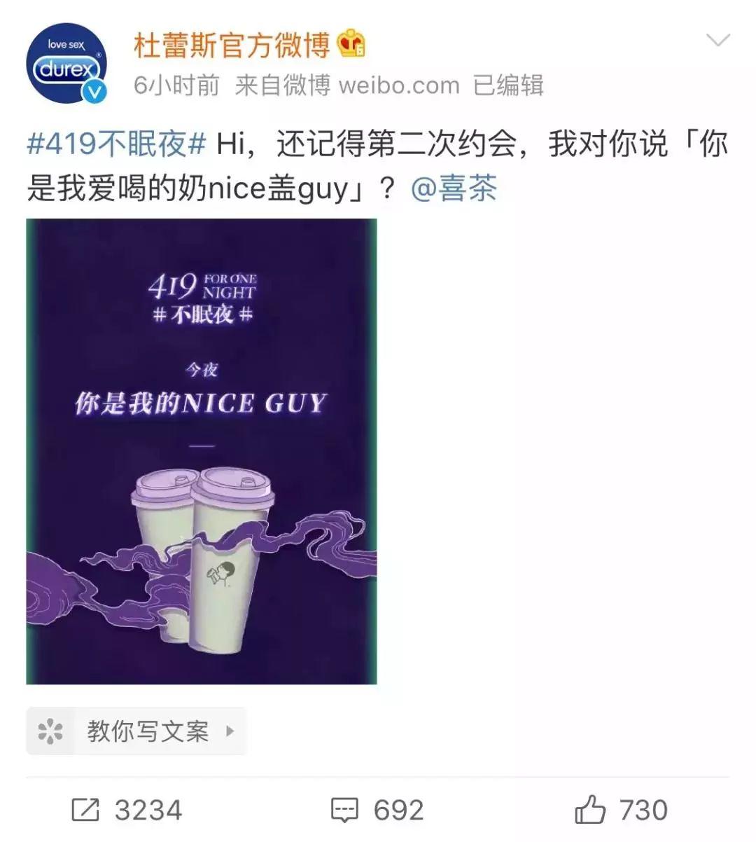 老司機杜蕾斯以及網紅喜茶在419在追熱點的路上翻車了。