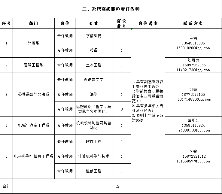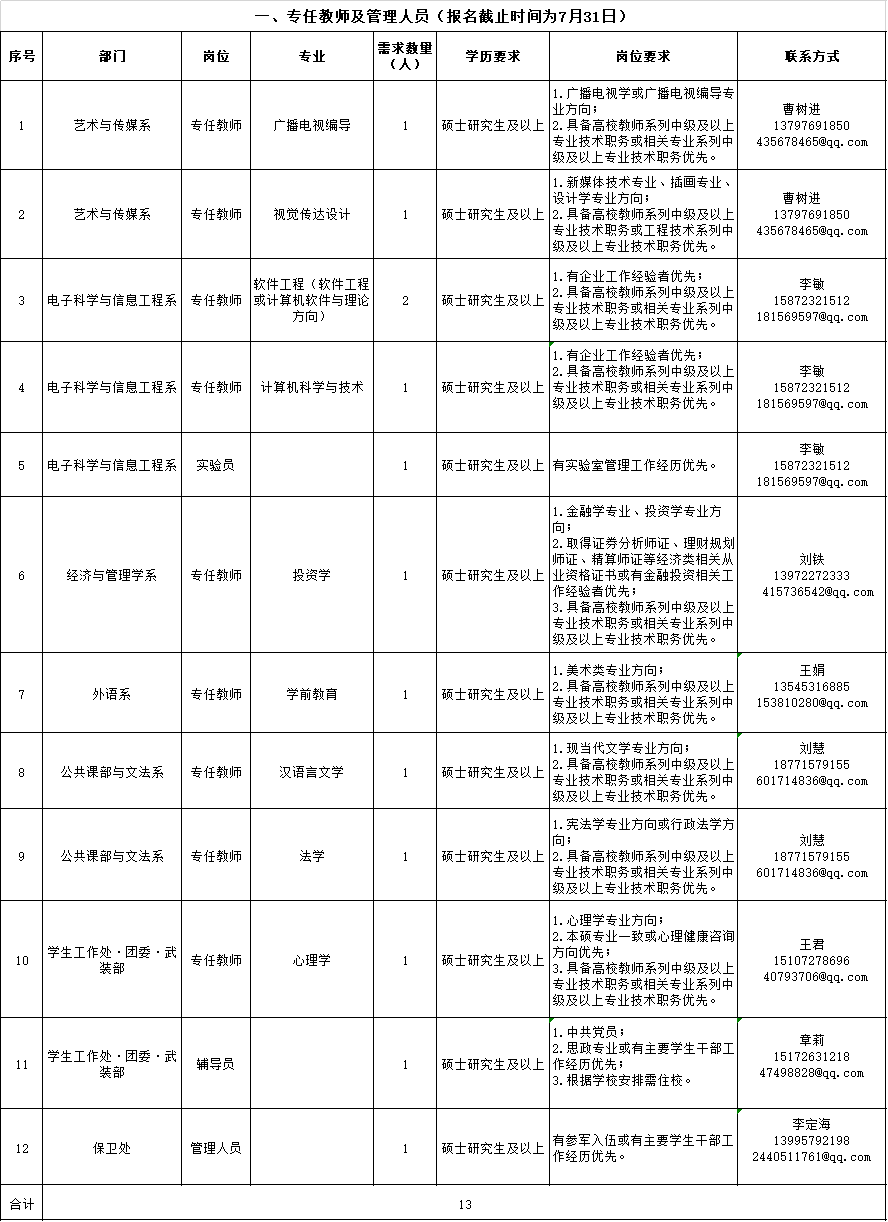 本次公開招聘涉及專任教師、實驗員、輔導員及管理崗位共計12個,共招聘13人;返聘高級職稱專任教師共12人。