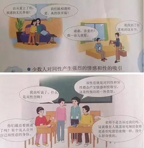 在五年級下冊的“青春期的愛情”章節中,介紹了異性之間的愛情和同性之間的愛情。在六年級上冊也有專門講述“性傾向”的單元。