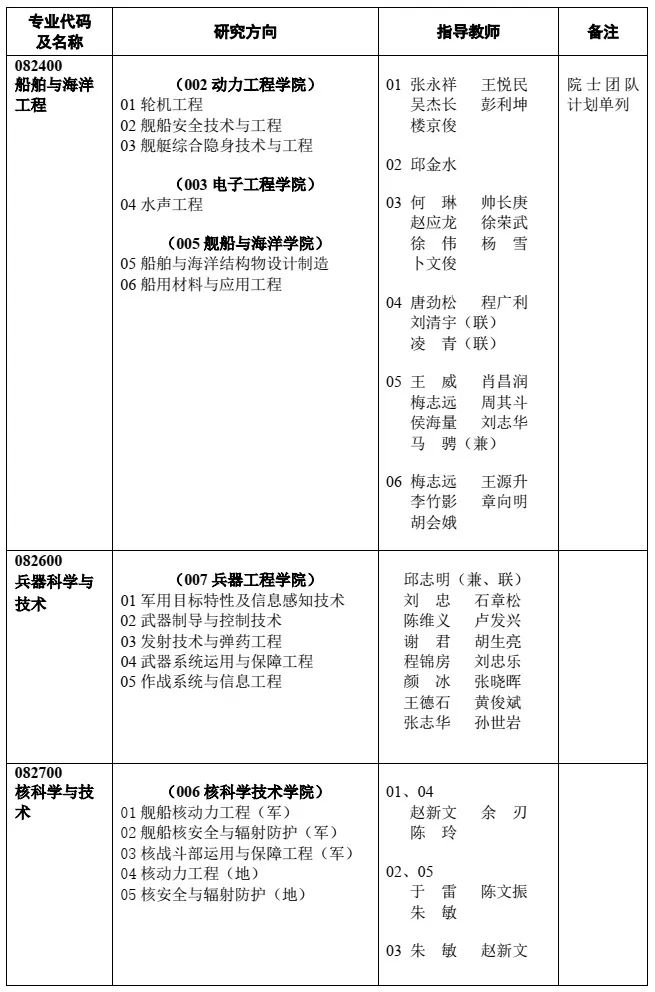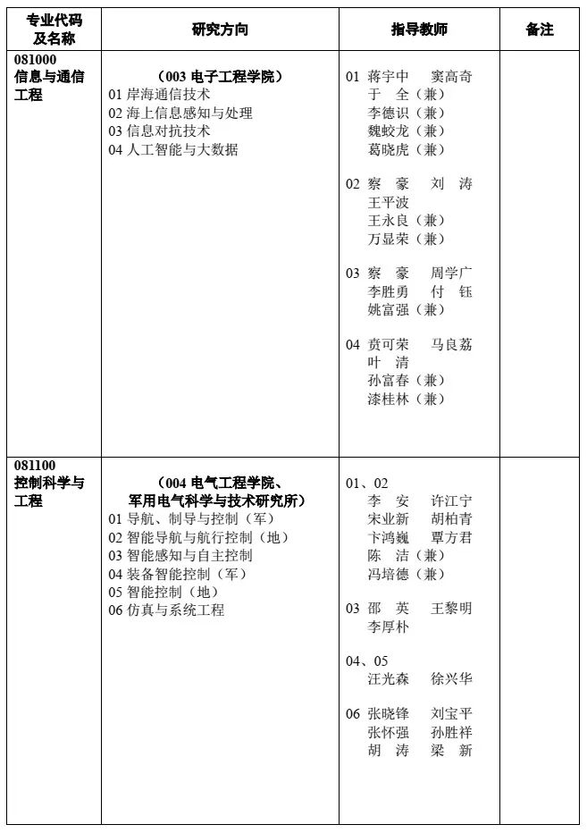 注:目錄中研究方向標注“(軍)”的為軍隊生研究方向,標注“(地)”的為地方生研究方向。未作標注的研究方向,軍隊、地方人員均可申請。