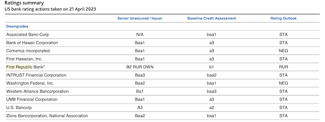 穆迪投資者服務公司于21日下調11家美國區域銀行評級,其中就包括第一共和銀行。在發送給第一財經記者的報告中,穆迪表示,相比全球同行,資本充足尤其是存款穩定歷來是美國銀行的優勢,然而最近的倒閉事件令人們質疑,一些銀行自稱其存款具高穩定性、經營狀況良好,這些是否應該被重新評估。