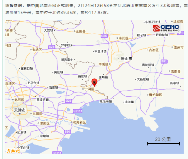 據中國地震臺網速報,2月24日,12時58分、13時44分,河北唐山發生3.0級、2.3級地震。有網友稱,“漢沽的被震醒了”“感覺到了”“正玩手機,嚇一跳”“衣柜也在動”。