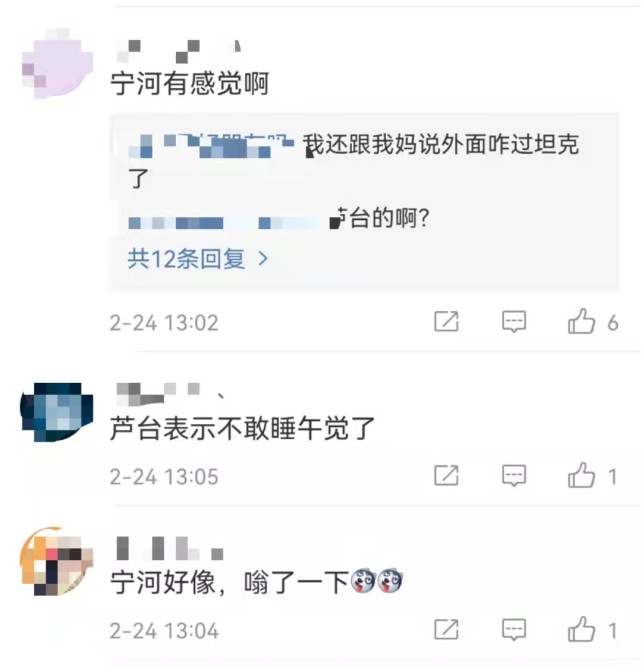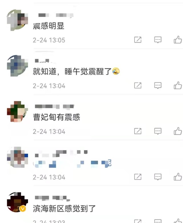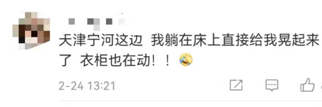 由于這兩次地震,震中比較靠近天津寧河區,許多天津網友表示有震感,“寧河好像嗡了一下”“寧河表示晃了好幾秒”“天津寧河這邊,我躺在床上直接給我晃起來了,衣柜也在動”“濱海新區生態城有震感”“剛好躺在床上,嚇死我了!”“太明顯了”。還有天津市濱海新區漢沽的網友表示,“漢沽農場震撼很強勢”“漢沽的被震醒了”“就知道睡午覺震醒了”。