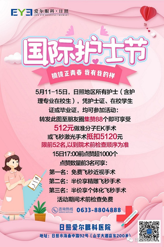 512國際護士節,日照愛爾眼科醫院送給護理工作者“變身”福利。5月11-15日,日照地區所有護士(含護理專業在校生),憑護士證、在校學生證或畢業證,均可參加活動: