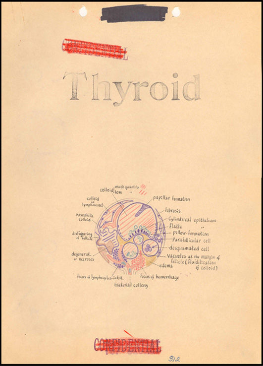 美國解密的七三一部隊人體實驗報告書——A報告的內頁影印件,本頁是人體器官甲狀腺感染炭疽菌圖(侵華日軍第七三一部隊罪證陳列館提供)