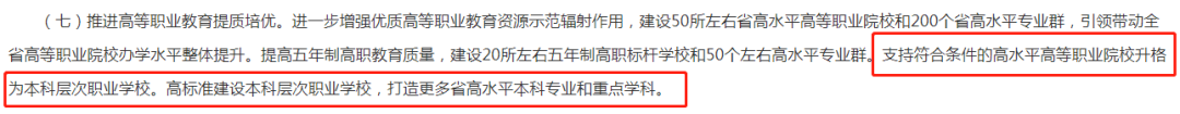 明確:支持符合條件的高水平高等職業院校升格為本科層次職業學校。高標準建設本科層次職業學校,打造更多省高水平本科專業和重點學科。