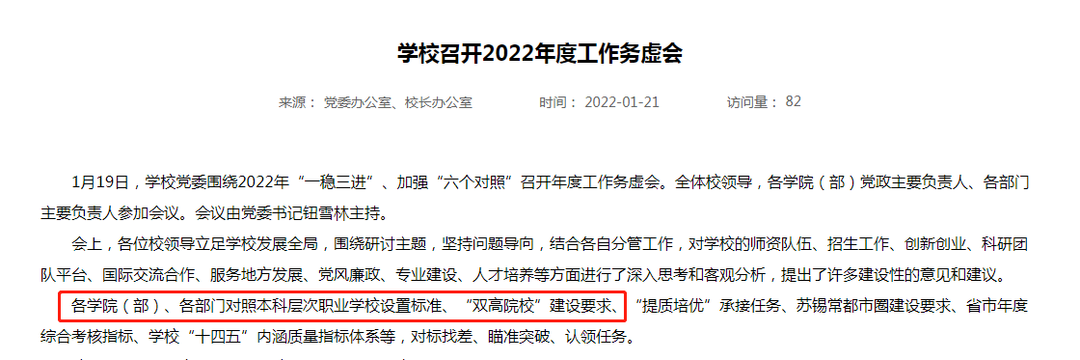 2022年1月19日,學校黨委召開年度工作務虛會。強調:各學院(部)、各部門對照本科層次職業學校設置標準、“雙高院校”建設要求等,對標找差、瞄準突破、認領任務。