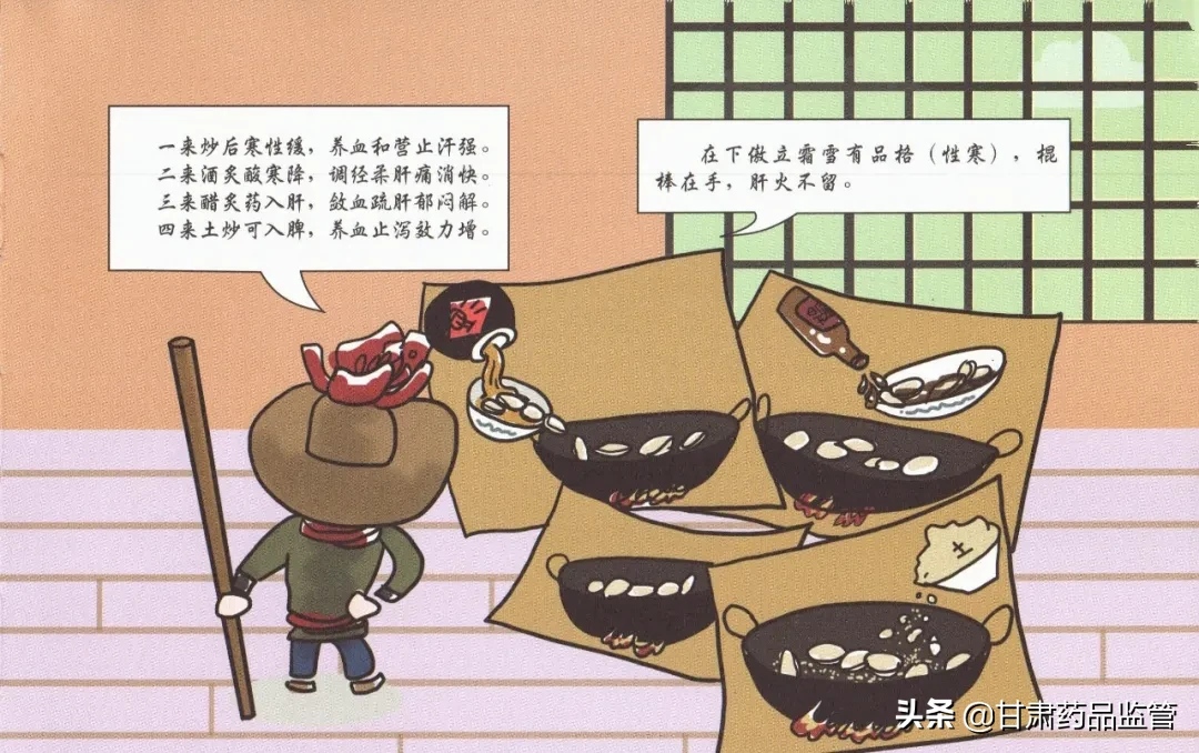 (3)醋白芍,取白芍片,加入定量米醋拌勻,稍悶潤,待醋被吸盡后,置炒制容器內,用文火加熱,炒干,取出晾涼。篩去碎屑,每100kg白芍片,用米醋15kg。醋白芍引藥入肝,斂血養血、疏肝解郁的作用最強。