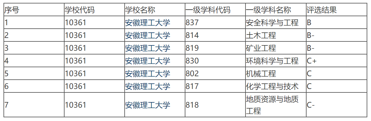 源自于淮南礦業學院的安徽理工大學,擁有7個參評學科,其中B類學科有3個:安全科學與工程、土木工程、礦業工程;C類學科有4個:環境科學與工程、機械工程、化學工程與技術、地質資源與地質工程;沒有A類學科。
