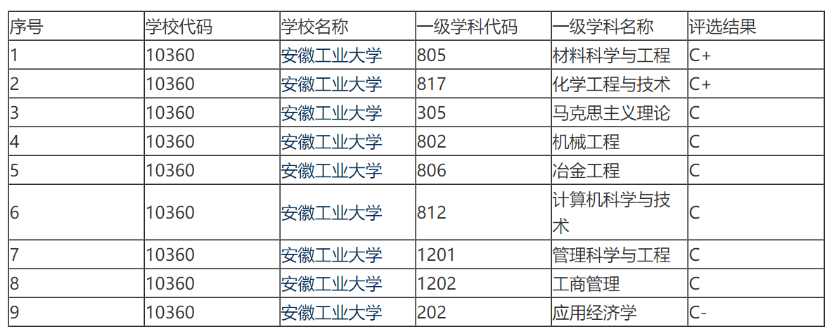 在教育部的第四輪學科評估中,前身是馬鞍山鋼鐵學院、擁有42年本科辦學歷史的安徽工業大學,共有9個參評學科,沒有A類和B類,材料、化工2個學科評估結果最好,為C+;馬克思主義理論、冶金、機械、計算機、工商管理等6個學科為C;應用經濟學為C-。