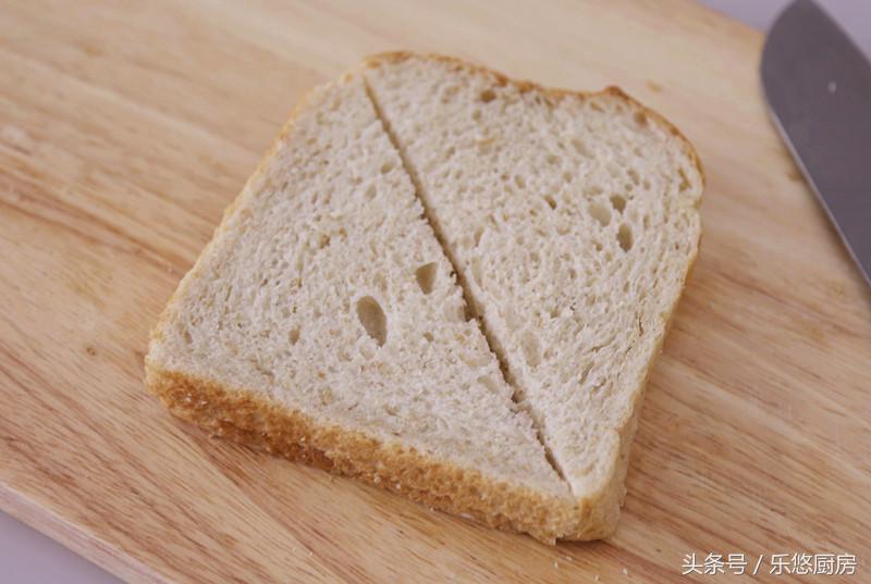 第五步:把面包片放入烤箱或者多士爐中加熱,然后切開,如圖。