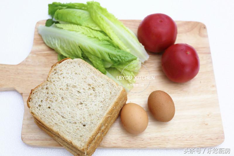 第一步:準備食材。全麥面包4片,雞蛋2個,西紅柿1個,生菜少許。(這是兩個人的量,親們可以隨自己的需求增減哦。)