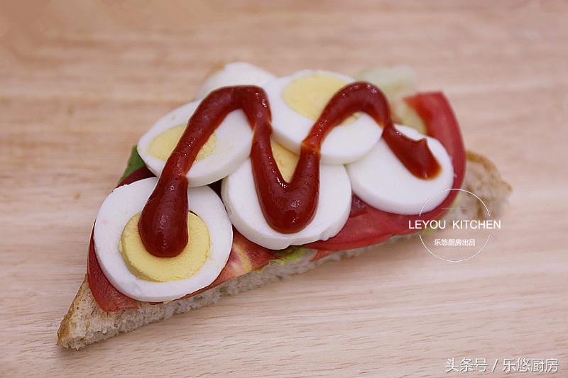 第六步:取一片面包,依次放上生菜,西紅柿片,雞蛋片,再擠上少許番茄醬,然后蓋上面包片,這樣依次把整個三明治做好。