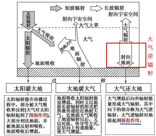 ③大氣還大地。大氣增溫后,會向宇宙和地面輻射(長波輻射),其中射向地面的部分,稱為大氣逆輻射,會使地面溫度升高,即大氣逆輻射的保溫作用。