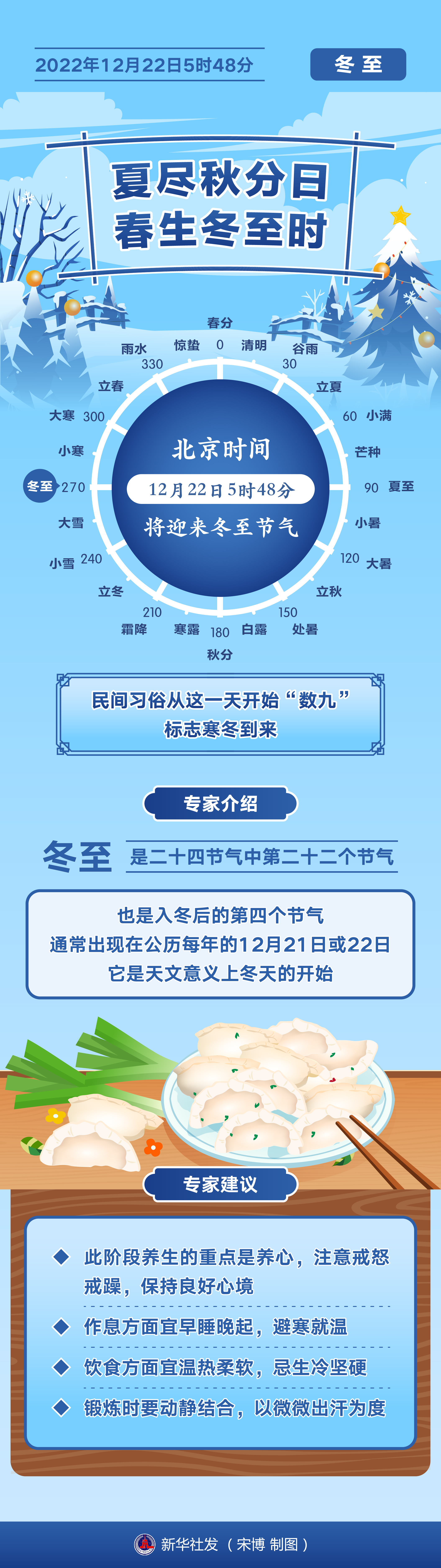 導讀新華社圖表,北京,2022年12月21日春生冬至時12月22日5時48分冬至“夏盡秋分日,春生冬至時”。北京時間12月22日5時48分將迎來冬至節氣,民間習俗從這一天開始“數九”,標志寒冬到