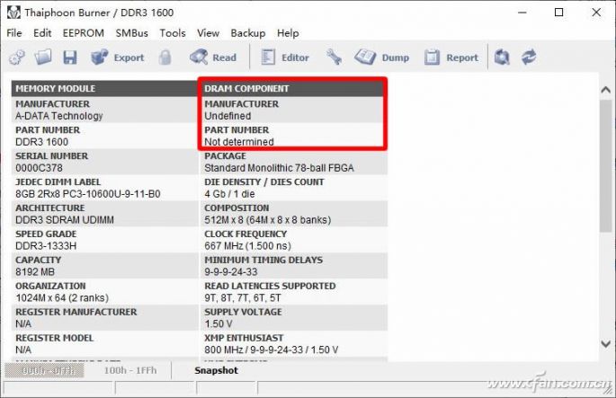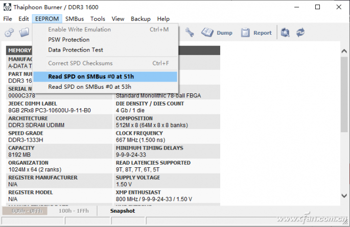 內存最需要注意的是內存顆粒是不是靠譜,那就用Thaiphoon Burner來看看吧,打開軟件后,選擇“EFPROM-Read SPD on SMBus xxxxx(根據內存所在插槽變化)”,就可以觀看內存條詳情了。