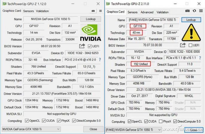 顯卡就更簡單了,最新版的GPU-Z已經可以讀取顯卡GPU的底層信息,而且如果與顯卡BIOS信息不符還會顯示警告信息。打開GPU-Z看到警告標志的話,馬上準備退換和投訴吧。