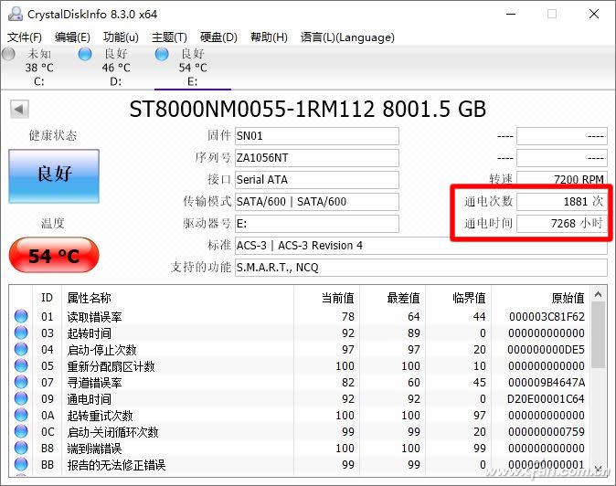 要識破這些配件的“畫皮”其實不難,只要找對軟件。比如要看硬盤和SSD,那么CrystalDiskInfo就很好用,它可以直接看各種SSD和機械硬盤的通電次數、通電時長,是不是二手貨就很明顯了。此外它還能看查看SSD的寫入容量,大概了解SSD的壽命。