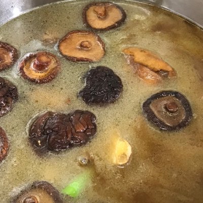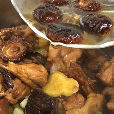 8、泡好的香菇和水一起倒入雞塊中