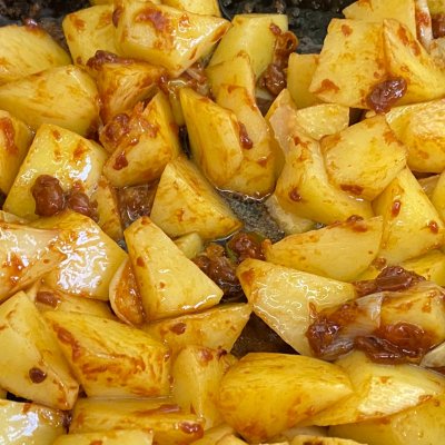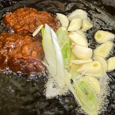 10、燉雞肉的時候,鍋中倒少量油,加入豆瓣醬,一起炒爆香一下土豆