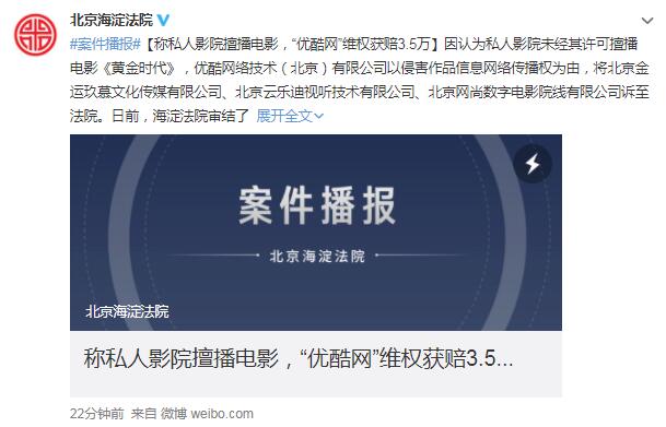 而糾紛的原因就是這家影院侵犯了優酷視頻的影視權,優酷表示,電影《黃金時代》是優酷買下的獨家網絡播放權,而影院未經許可就向大眾播放。