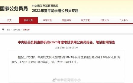 導讀9月30日,國家公務員局網站發布《中央機關及其直屬機構2023年度考試錄用公務員報名、筆試時間預告》,根據工作安排,中央機關及其直屬機構2023年度考試錄用公務員將于10月25日開始報名,12月3日至