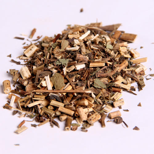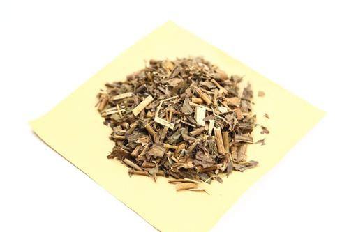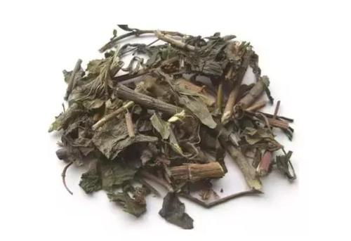 本品莖呈圓柱形,長30~100cm,直徑0.2~0.5cm;表面黃棕色或黃綠色,有的帶紫色,有明顯的節和縱棱線;質脆,斷面髓部白色或中空。葉對生,有柄,葉片多皺縮、破碎,綠褐色;完整葉片3裂或不分裂,分裂者中間裂片較大,展平后呈披針形或長圓狀披針形,基部狹窄,邊緣有鋸齒;不分裂者展平后呈卵圓形、卵狀披針形或橢圓形。氣芳香,味微苦。