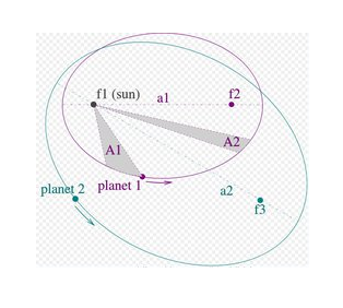 接著,開普勒又發現火星的運行速度不是勻速的,當它離太陽較近時運動得較快(近日點),離太陽較遠時運動得較慢(遠日點)。但從任何一點開始,向徑(太陽中心到行星中心的連線)在相等的時間所掃過的面積都相等。這就是“開普勒第二定律(面積定律)”。