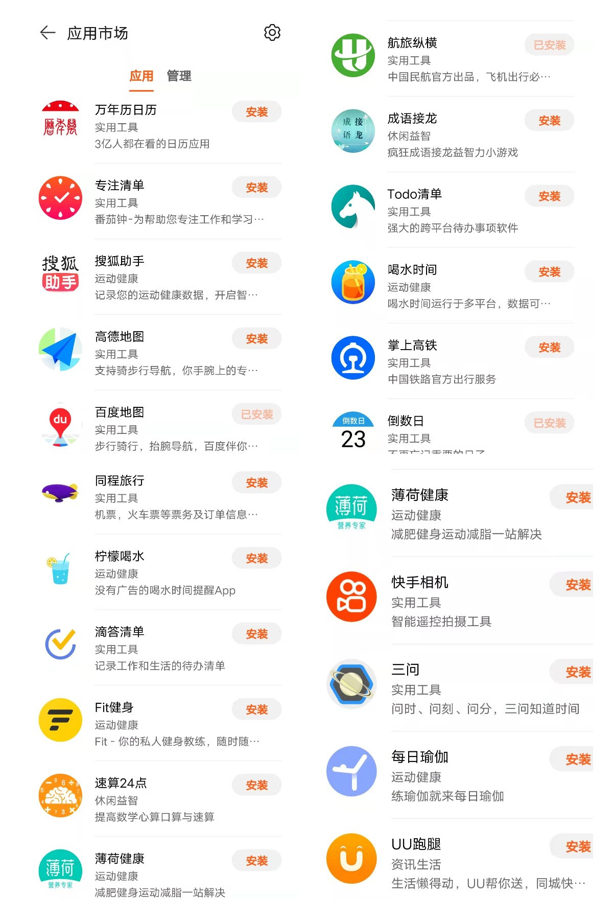 提到第三方APP,榮耀手表GS 3相比許多競品的一大優勢在與其在基礎功能之外支持了更多第三方APP,大大拓寬了使用場景,目前可供下載安裝的共有25款,包括高德地圖、百度地圖、喜馬拉雅穿戴、航旅縱橫、掌上高鐵、滴答清單等。