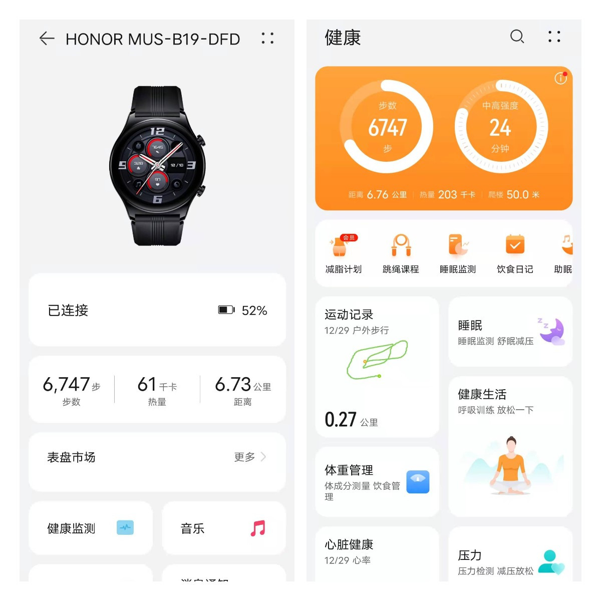榮耀手表GS 3在手機端有運動健康APP與之配合使用,實現與手機的配對、固件的下載更新、表盤導入、第三方APP的導入等操作,同時也包括查看運動健康方面的詳細數據。
