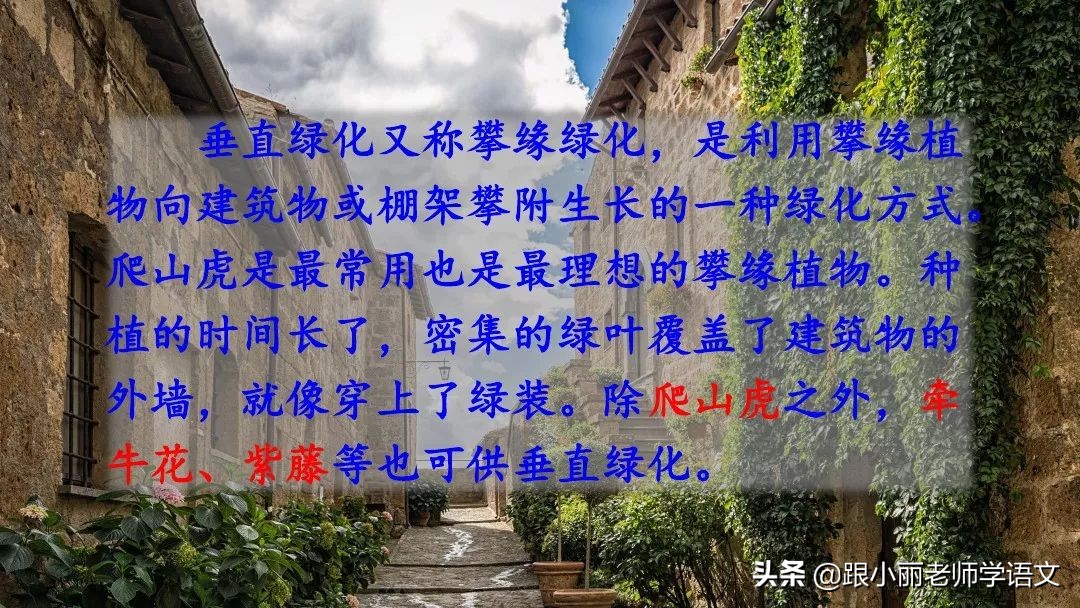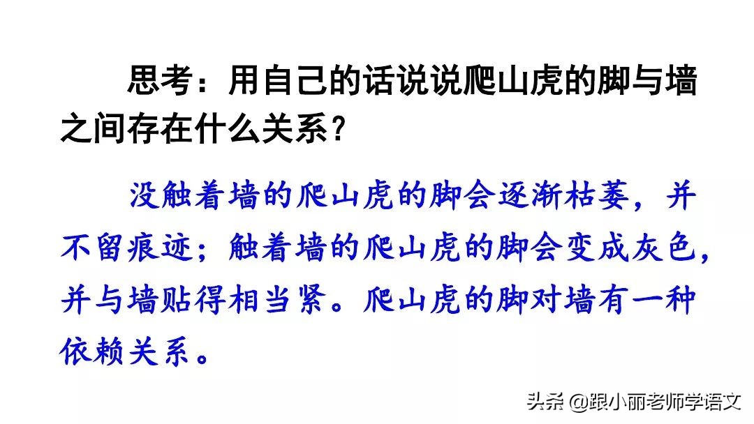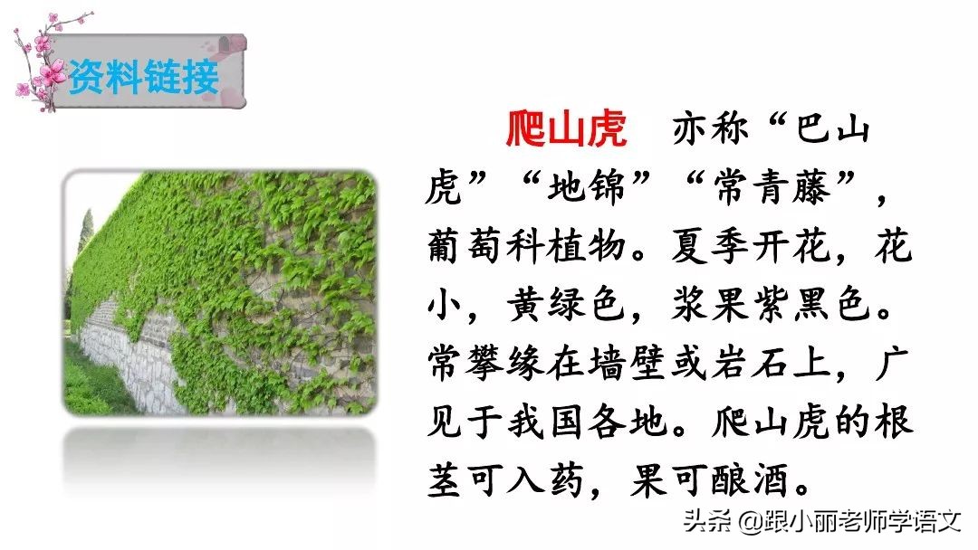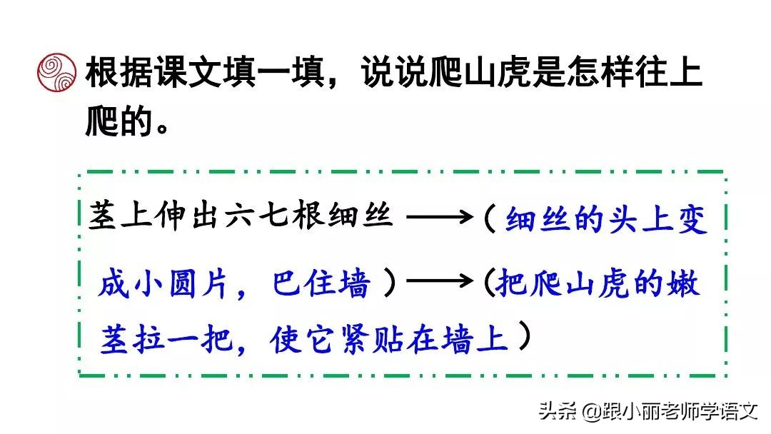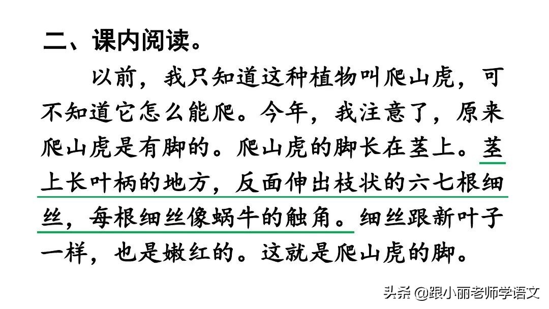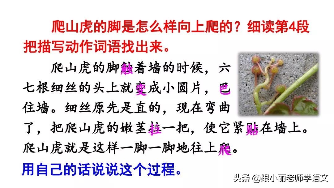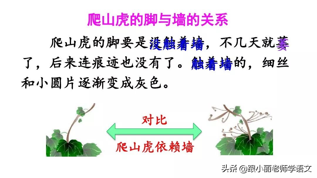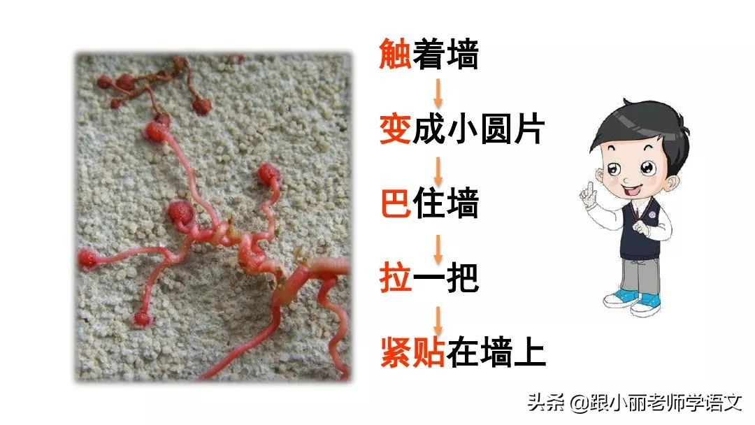 4.爬山虎的腳觸著墻時是怎樣變化的?“六七根細絲的頭上就變成小圓片,巴住墻”;細絲原先是直的,巴住墻就彎曲了,“把爬山虎的嫩莖拉一把,使它緊貼在墻上”。細絲由“直”到“彎”,縮短了距離,所以產生了拉力;由于產生了拉力,它在墻上才貼得很緊。