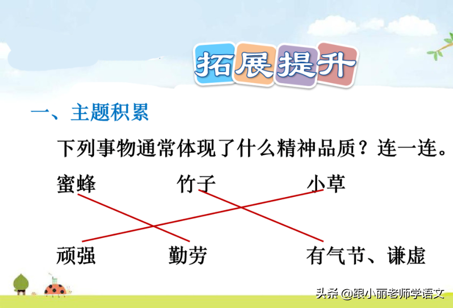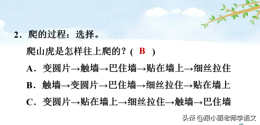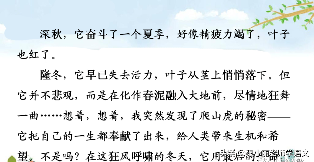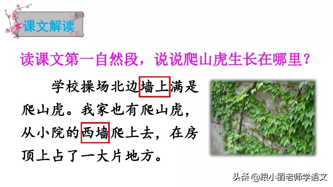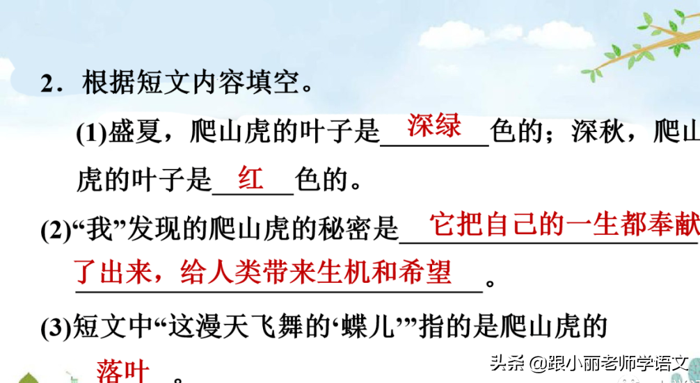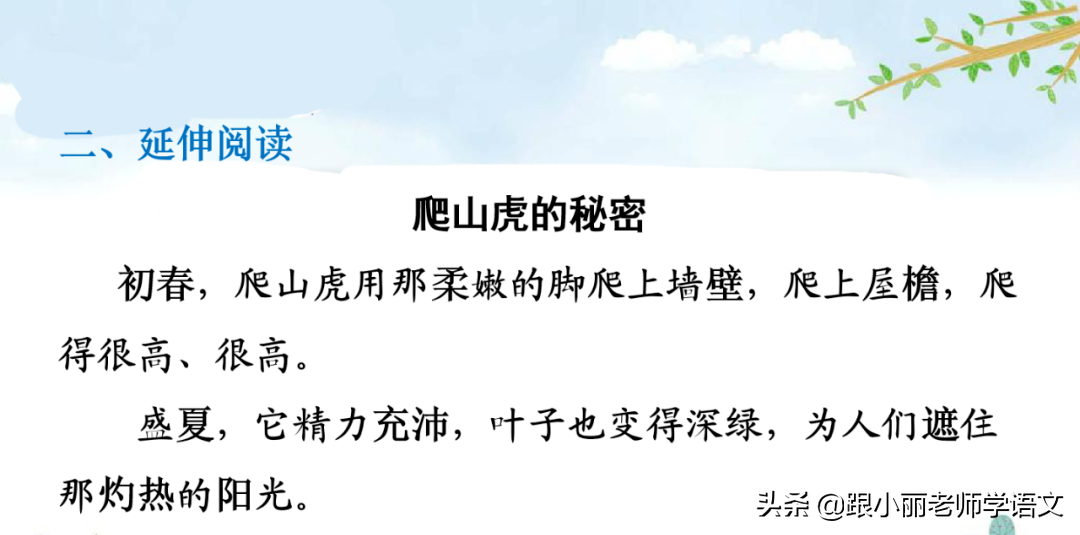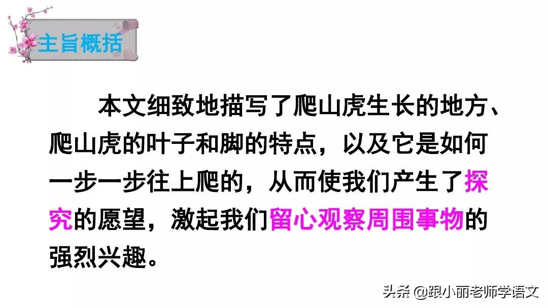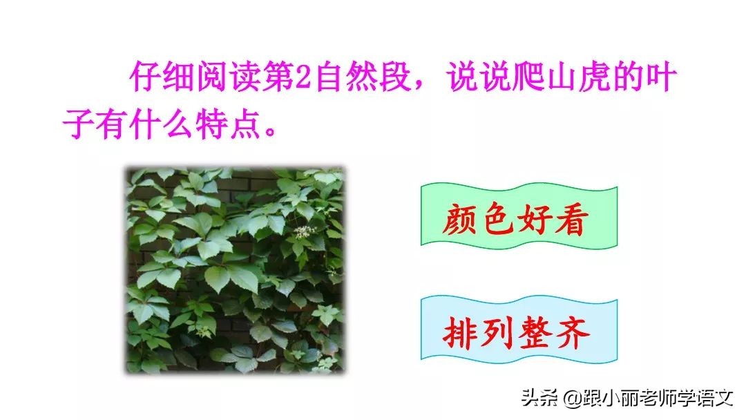 2.本文的課題是《爬山虎的腳》,作者對爬山虎的腳作了十分具體的介紹,那為什么又寫了爬山虎的葉子?因為人們主要觀賞的不是爬山虎的腳,而是爬山虎好看的葉子。