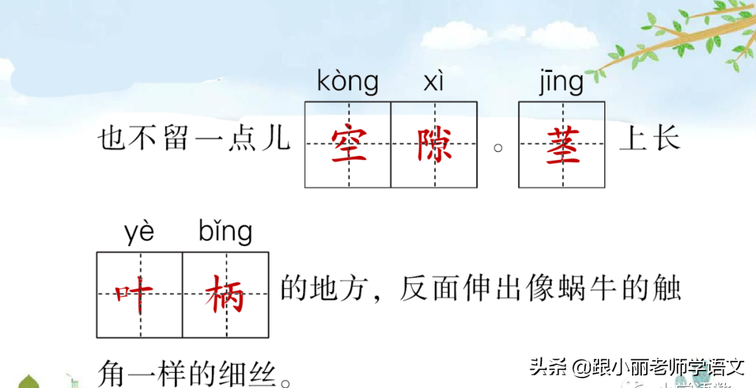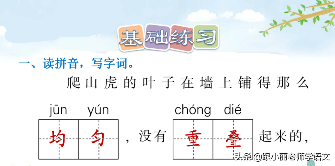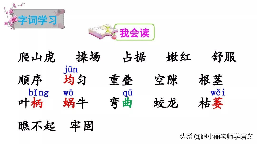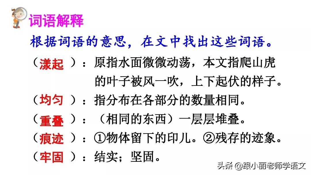 均勻:分布在各部分的數量相同。如:雨量均勻。空隙:中間空著的地方。嫩莖:初生而柔弱的莖。拂過:本課指風輕輕吹過爬山虎的葉子。痕跡:事物留下的印痕。本課指沒有觸著墻的爬山虎的腳,不幾天連一點印痕都沒有了。休想:別想;不要妄想。漾起波紋:原指水面微微動蕩,本文指爬山虎的葉子被風一吹,象波浪一樣上下起伏。蛟龍:古代傳說中指興風作浪、能發洪水的龍。牢固:結實;堅固。