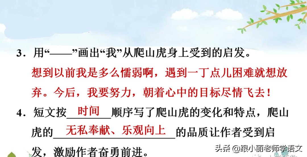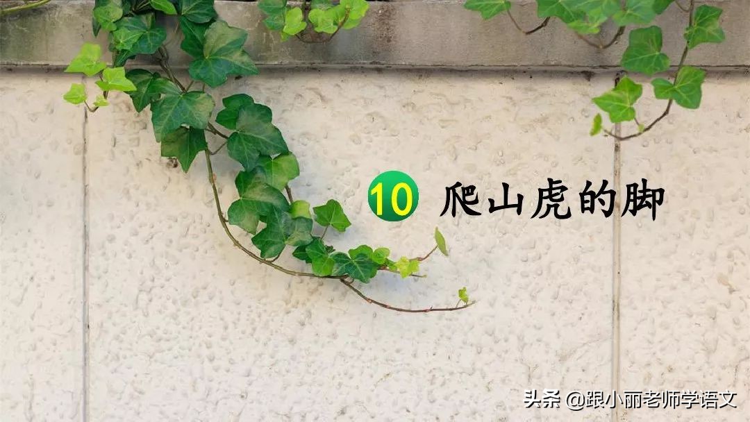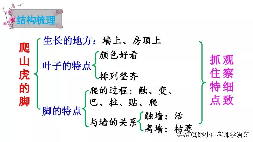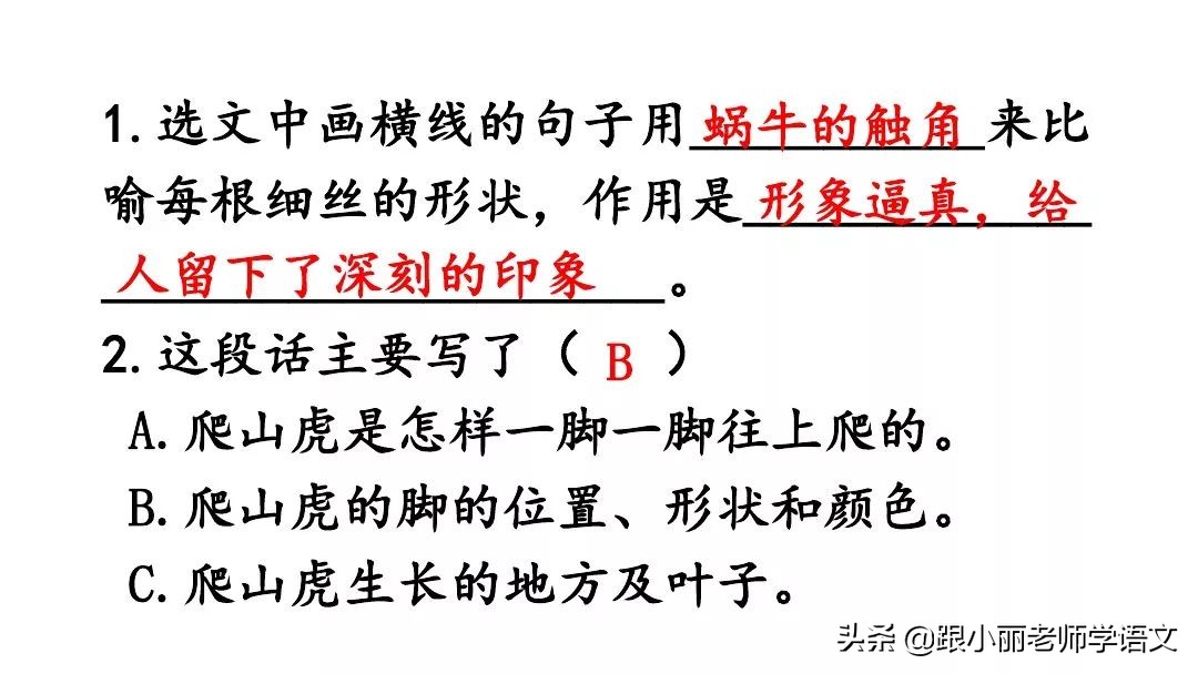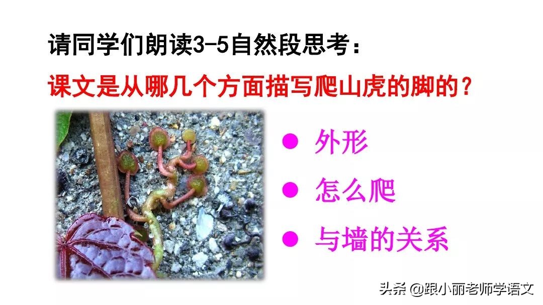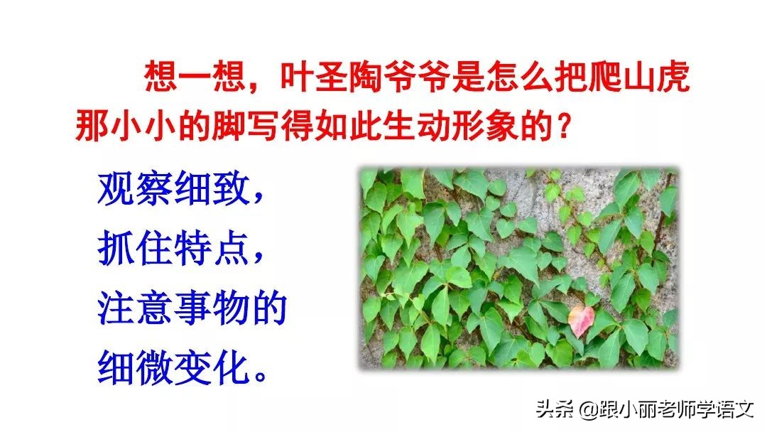 3.題目是《爬山虎的腳》,為什么不只寫腳,而要先寫葉子呢?原因有兩個:一是爬山虎的葉子靠腳才能夠爬滿墻,這滿墻的葉子,正是腳的功勞,進一步突出了腳的作用之大;二是我們通常先看到的是爬山虎的葉子,仔細觀察才能看清爬山虎的腳,所以先寫了葉子。