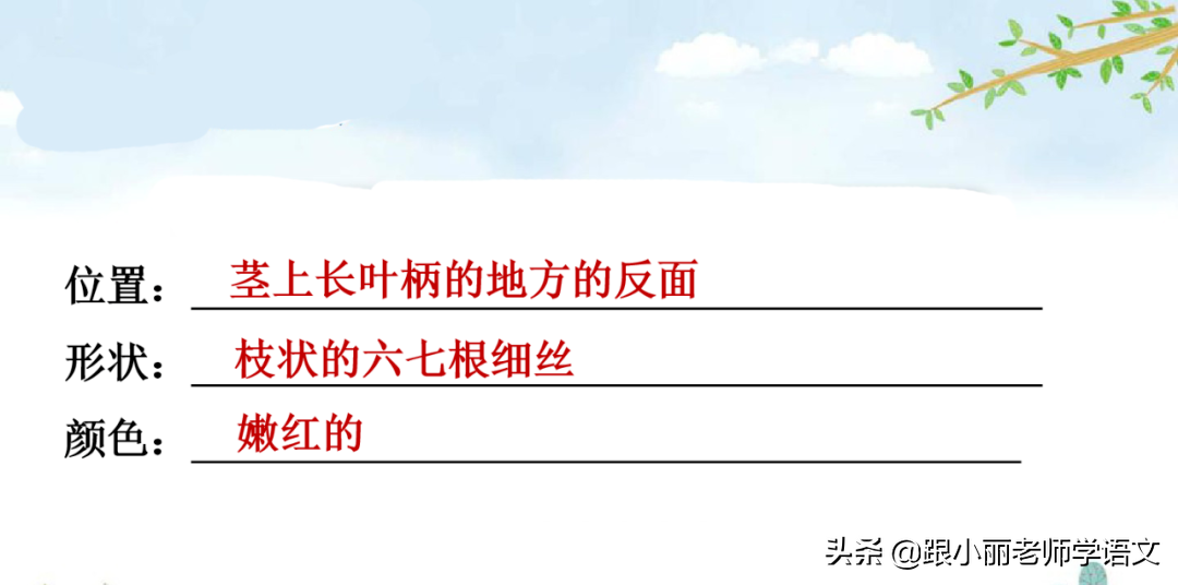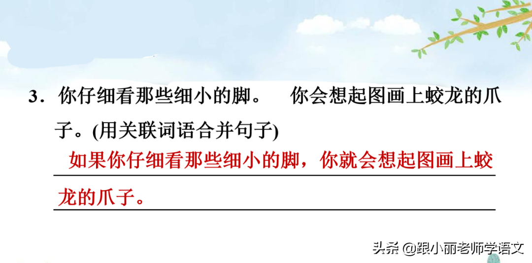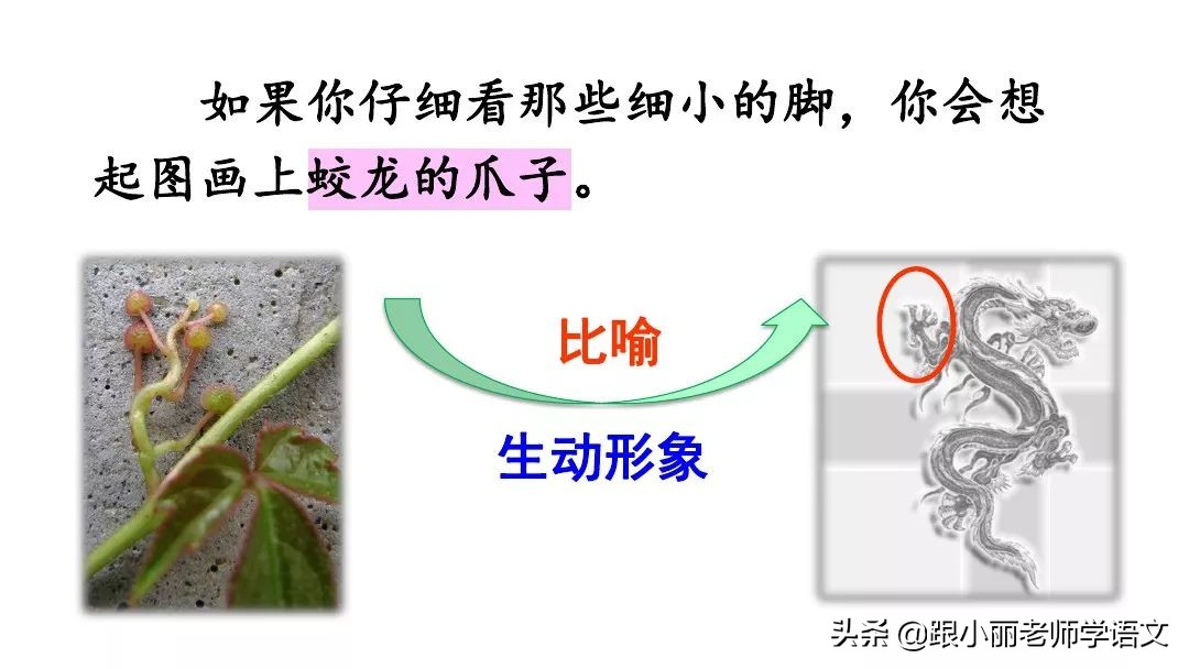 2.爬山虎的腳長在莖上。莖上長葉柄的地方,反面伸出枝狀的六七根細絲,每根細絲像蝸牛的觸角。細絲跟新葉子一樣,也是嫩紅的。“葉柄”是連接葉片和莖的部分。作者用這三句話介紹了爬山虎的腳長在哪里,形狀和顏色是怎樣的。中間的長句子是對第一句的補充,更具體地說明腳是長在莖與葉柄相連之處,而且是從葉柄的反面伸出來的,它由六七根枝狀細絲組成。作者又以蝸牛的觸角比喻每根細絲的形狀,寫得非常逼真,可見作者對事物的觀察十分仔細、認真。如果你仔細看那些細小的腳,你會想起圖畫上蛟龍的爪子。這句話采用了比喻的修辭方法,將爬山虎的腳比作蛟龍的爪子,形象地寫出了爬山虎腳的外形特點。