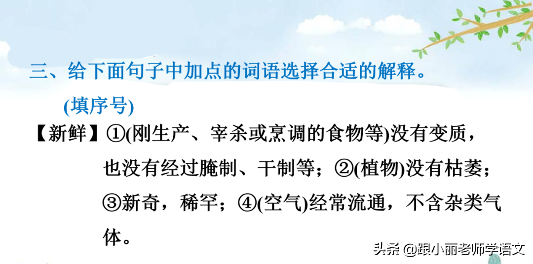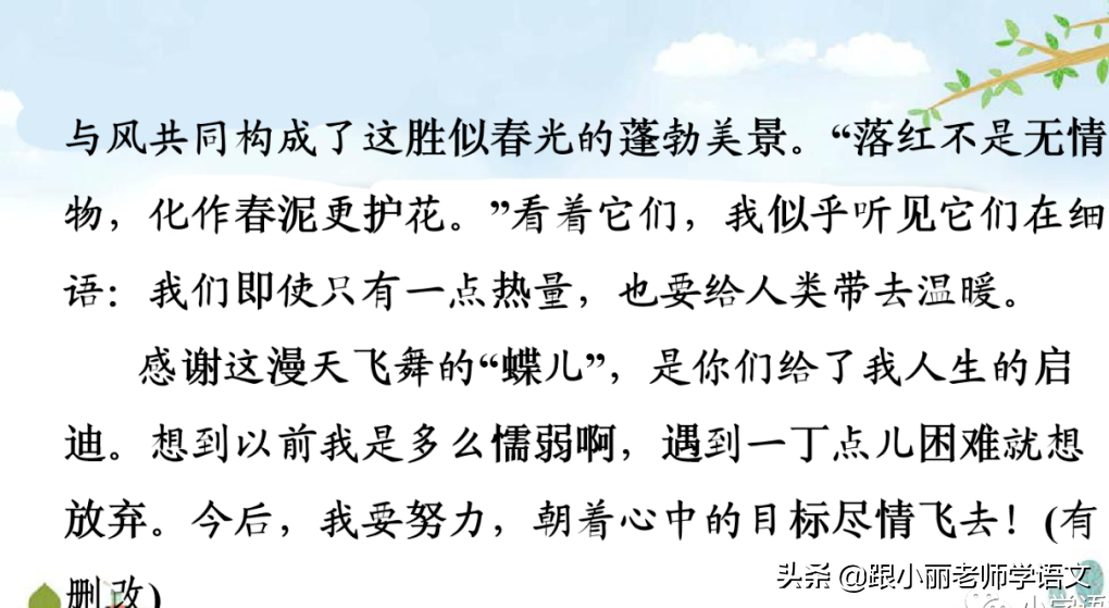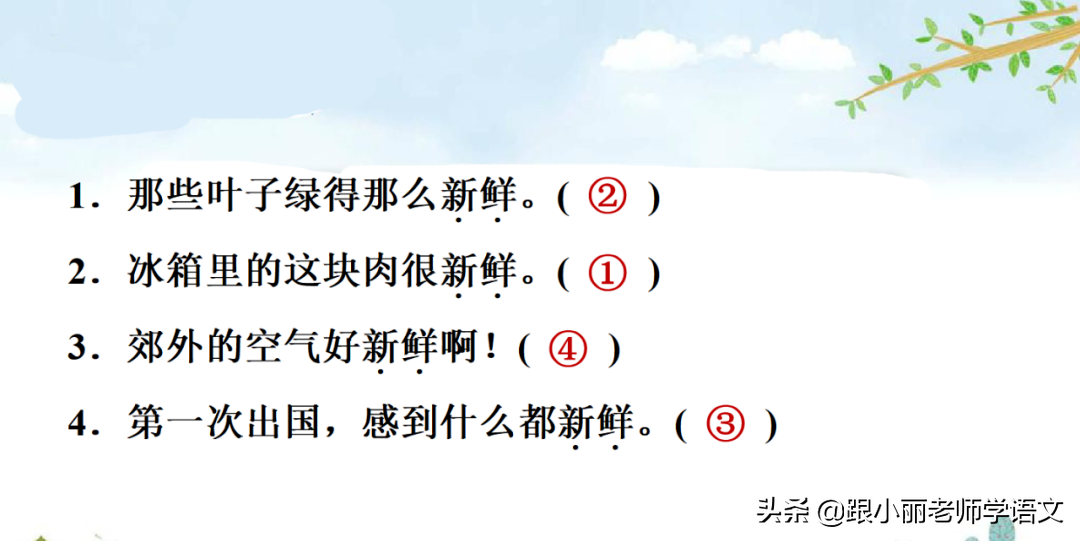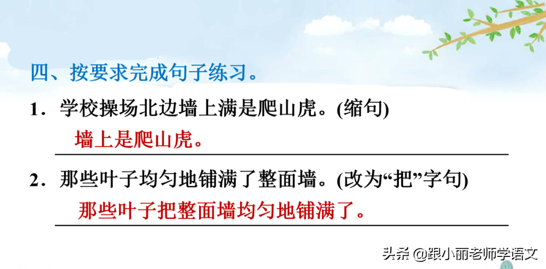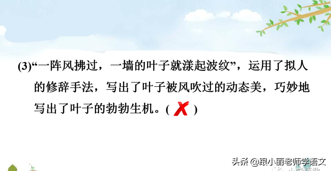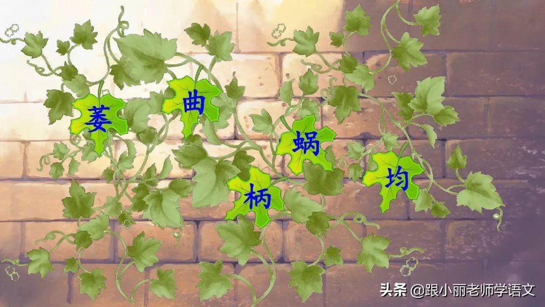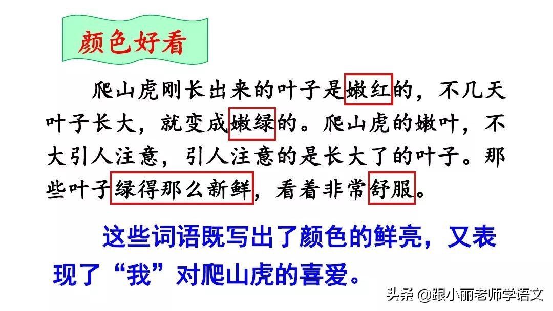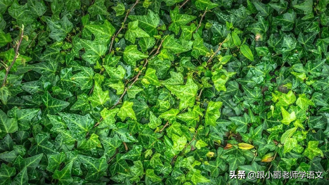 1.那些葉子綠得那么新鮮,看著非常舒服。葉尖一順兒朝下,在墻上鋪得那么均勻,沒有重疊起來的,也不留一點兒空隙。“一順兒”是指同一個方向或順序;“鋪”在這里讀 pū。這兩句話具體地寫出了爬山虎葉子的特點。先概括地寫出葉子綠得新鮮,看著舒服。令人驚嘆的卻是葉子長得如此整齊,鋪排得那么均勻──“葉尖一順兒朝下”,沒有一片葉子是朝另一個方向的;“沒有重疊起來的,也不留一點兒空隙”,就好像是哪位高明的畫家創作的一幅圖畫。